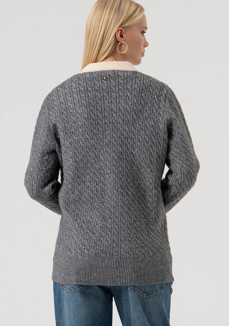 Cardigan regular lungo con punto treccia, scollo a V, bottoni gioiello centrali per apertura, tasche applicate, e con maniche lunghe.