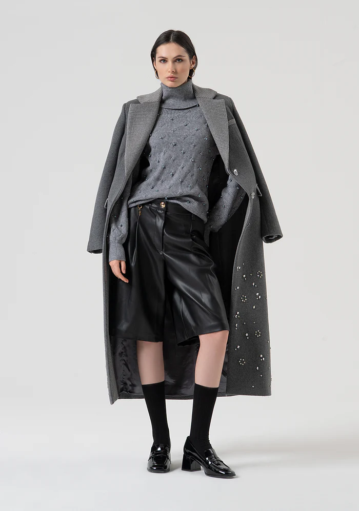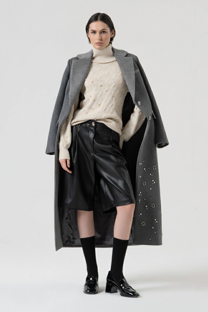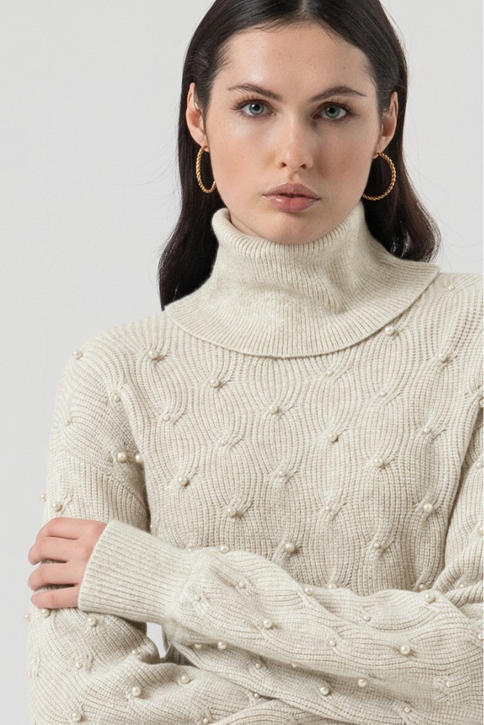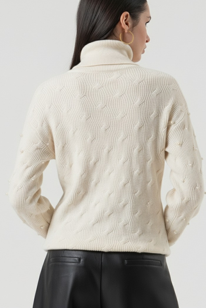 Maglia regular con punto treccia e perle, collo alto e maniche lunghe