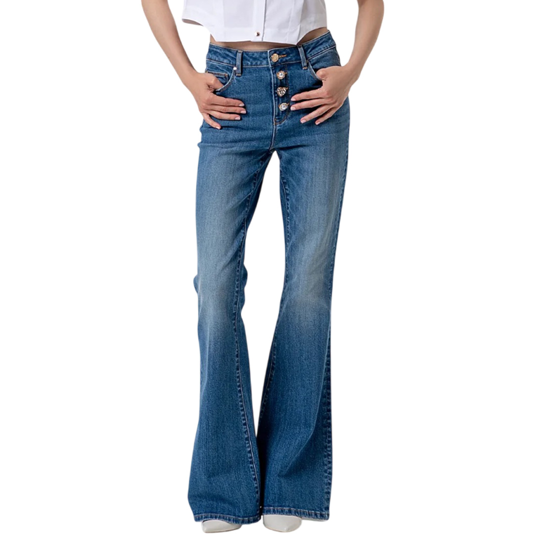 Jeans bootcut in denim con lavaggio vintage, vita alta, bottoni gioiello a vista, 5 tasche, e con fondo ampio.