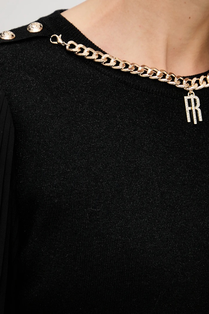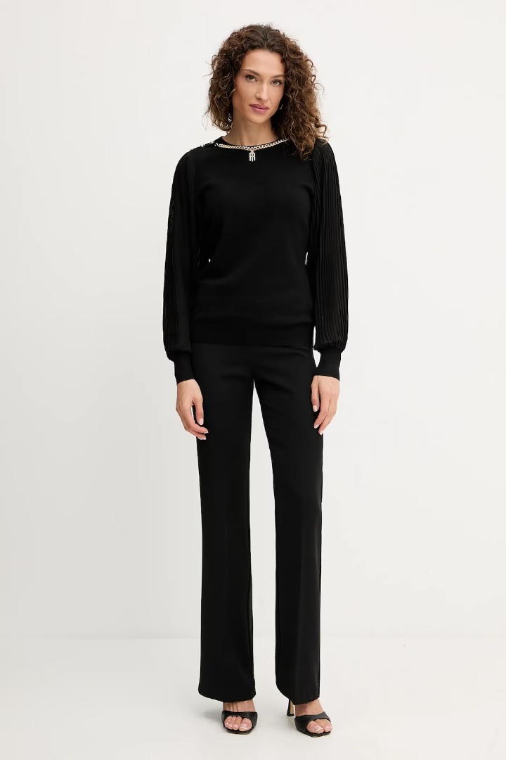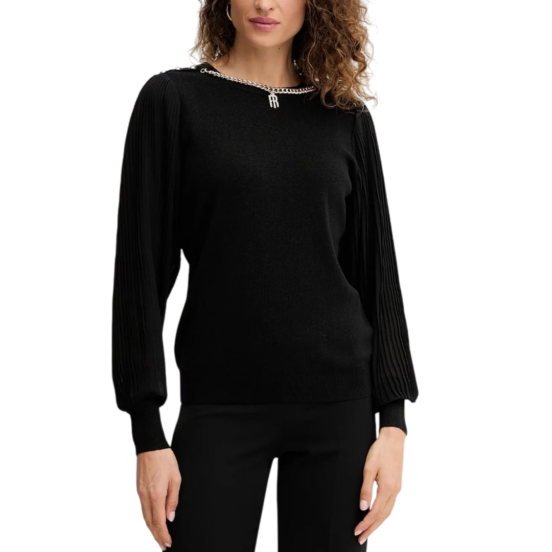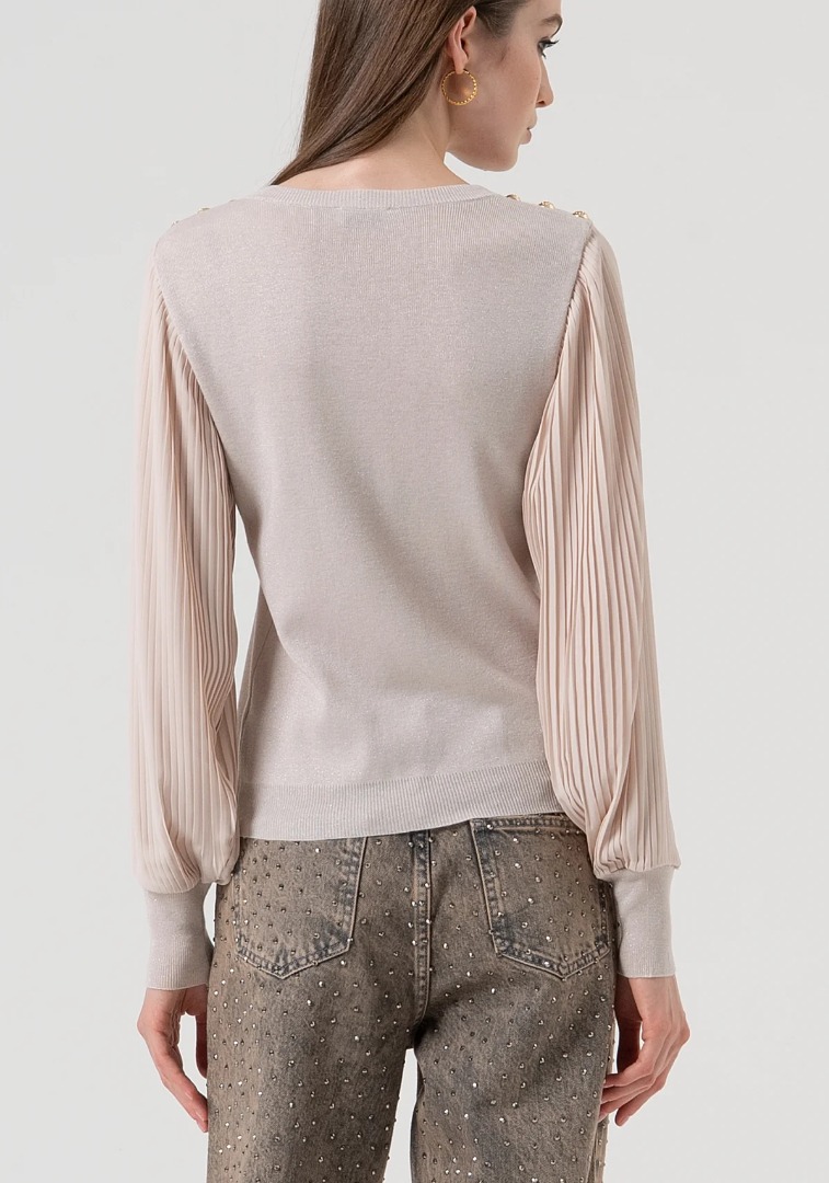 Maglia regular con lana e lurex, girocollo con accessorio gioiello applicato, e con maniche a palloncino lunghe in georgette plissettato