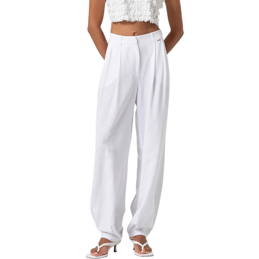 Pantalone flare a palazzo con lino, vita alta, pences, tasche alla francese laterali, e con fondo ampio.