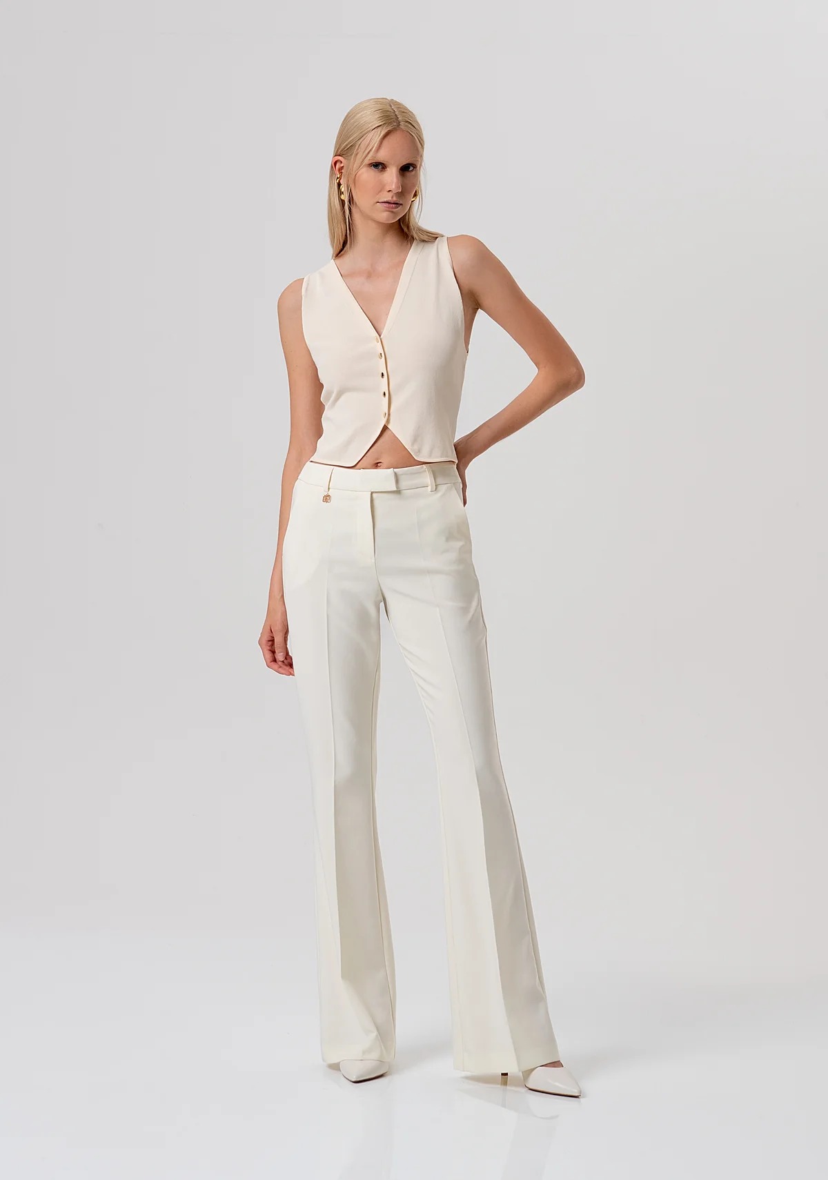 Questi pantaloni rappresentano l'incontro perfetto tra la precisione della sartoria classica e un design contemporaneo e femminile. Pensati per valorizzare la figura con una linea pulita ed elegante, sono un capo versatile ideale per il business wear o per occasioni formali che richiedono un tocco di ricercatezza in più. Il modello presenta un taglio flare (a zampa) che accarezza i fianchi per poi aprirsi armoniosamente verso il fondo, creando un effetto slanciante e fluido nel movimento. La vita alta è strutturata con una cintura piatta dotata di passanti, che assicura una vestibilità impeccabile e definisce la silhouette. L'elemento distintivo è il piccolo logo metallico dorato applicato discretamente sotto il passante frontale, un dettaglio gioiello che sigla l'esclusività del brand. La parte posteriore è rifinita con tasche a filo (a filetto), che mantengono la linea del pantalone minimale e levigata. La chiusura frontale con zip e gancio a scomparsa garantisce una continuità estetica perfetta