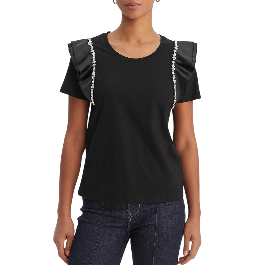 T-shirt regular in jersey di cotone, girocollo, rouches con applicazioni luminose, e con maniche corte.
