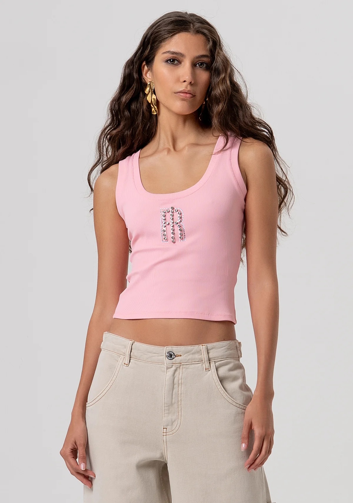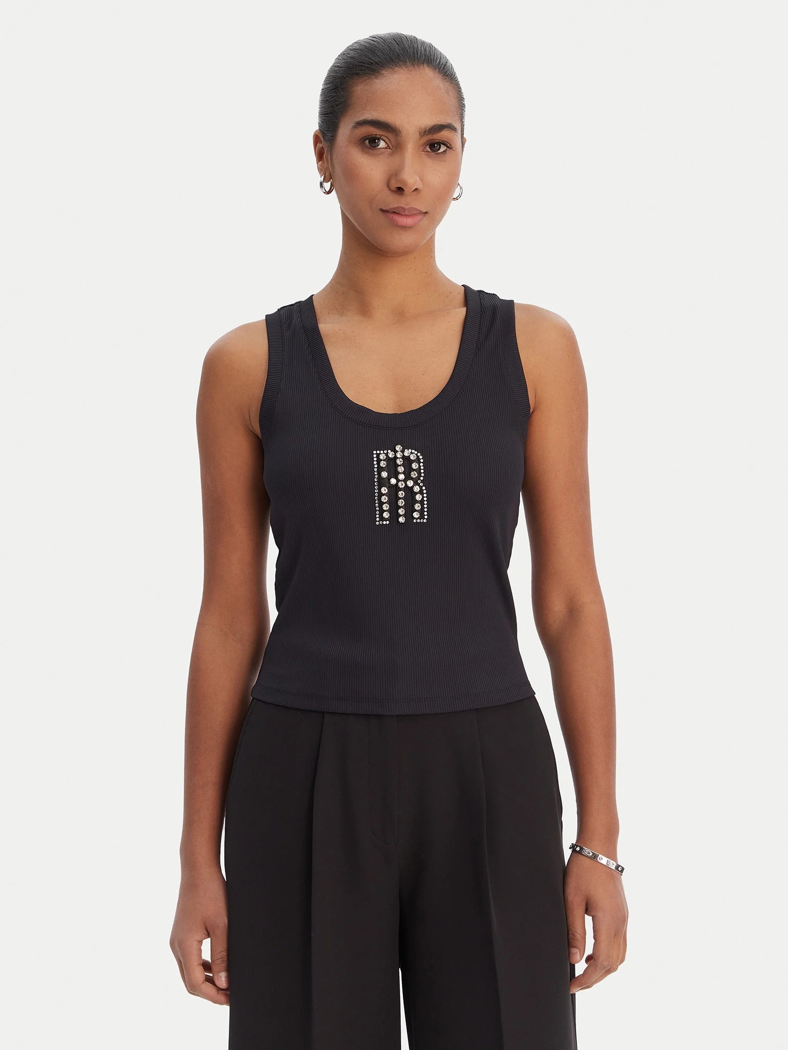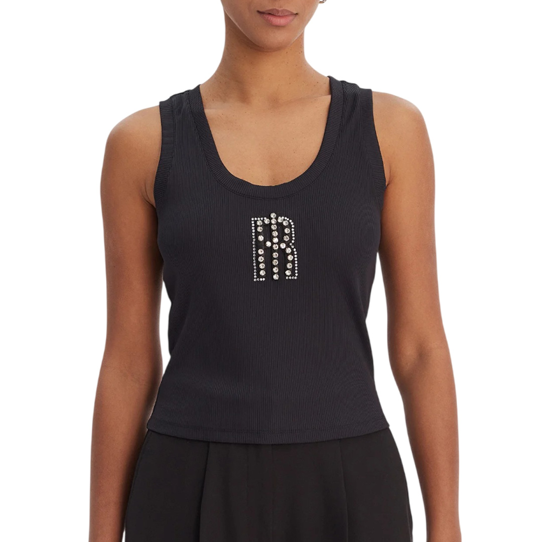 Questa canotta è un capo essenziale che unisce il comfort dello stile urban a un tocco di luce lussuoso e sofisticato. Perfetta per chi desidera un look minimalista ma ricercato, è l'ideale per completare outfit stratificati o per essere indossata come protagonista assoluta durante la stagione calda. Il capo è realizzato in un morbido tessuto a costine elasticizzato, che assicura una vestibilità aderente e segue armoniosamente le linee del corpo. Il design presenta uno scollo a U profondo e spalline larghe, che donano un'estetica sportiva ed elegante al tempo stesso. Il vero punto focale della canotta è il logo monogramma applicato centralmente sul petto, interamente impreziosito da cristalli e strass brillanti. Questa lavorazione gioiello trasforma un capo basico in un elemento distintivo, capace di riflettere la luce a ogni movimento e di aggiungere un tocco glamour anche agli abbinamenti più semplici.