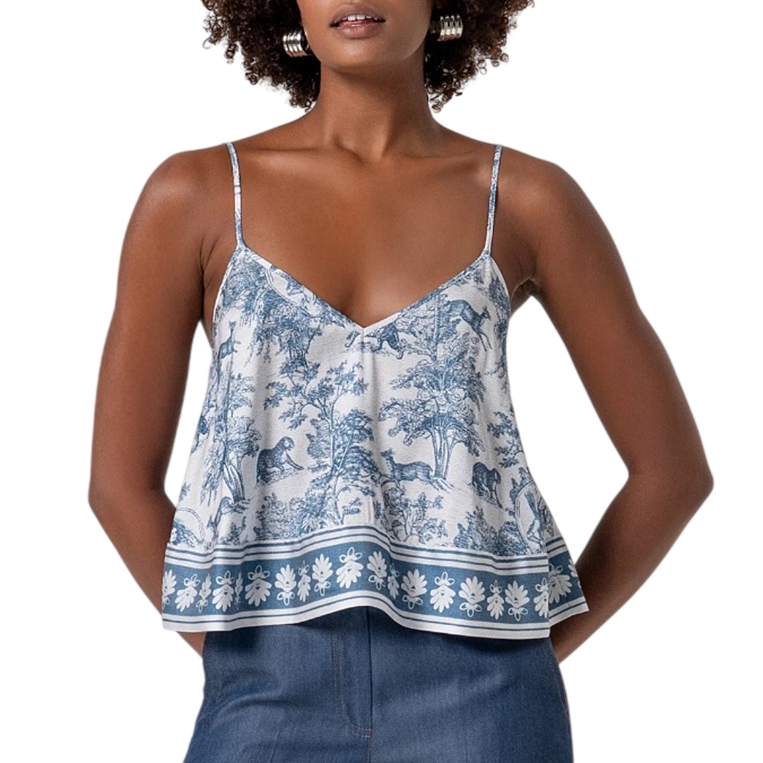 Top senza maniche in fantasia, scollo a V, e con bretelline sottili.