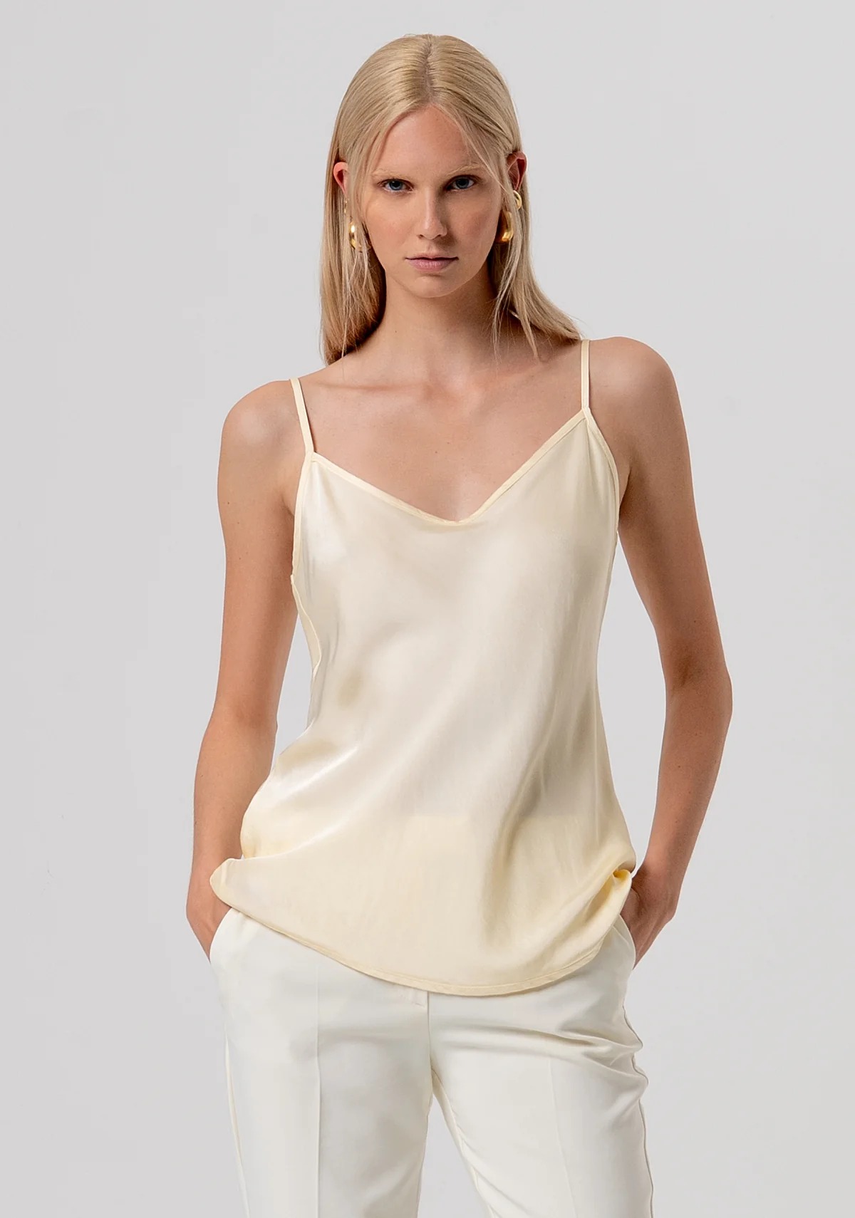 Top senza maniche in raso di viscosa, scollo a V, e con bretelline sottili.