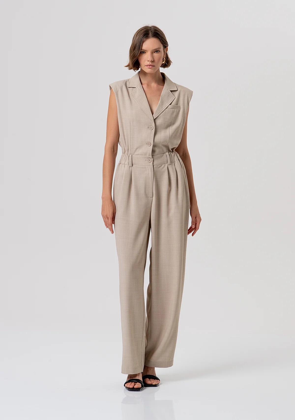 Tuta senza maniche con pantaloni lunghi, revers classico, bottoni centrali per apertura, vita alta con elastico, tasche laterali, e con fondo del pantalone dritto.