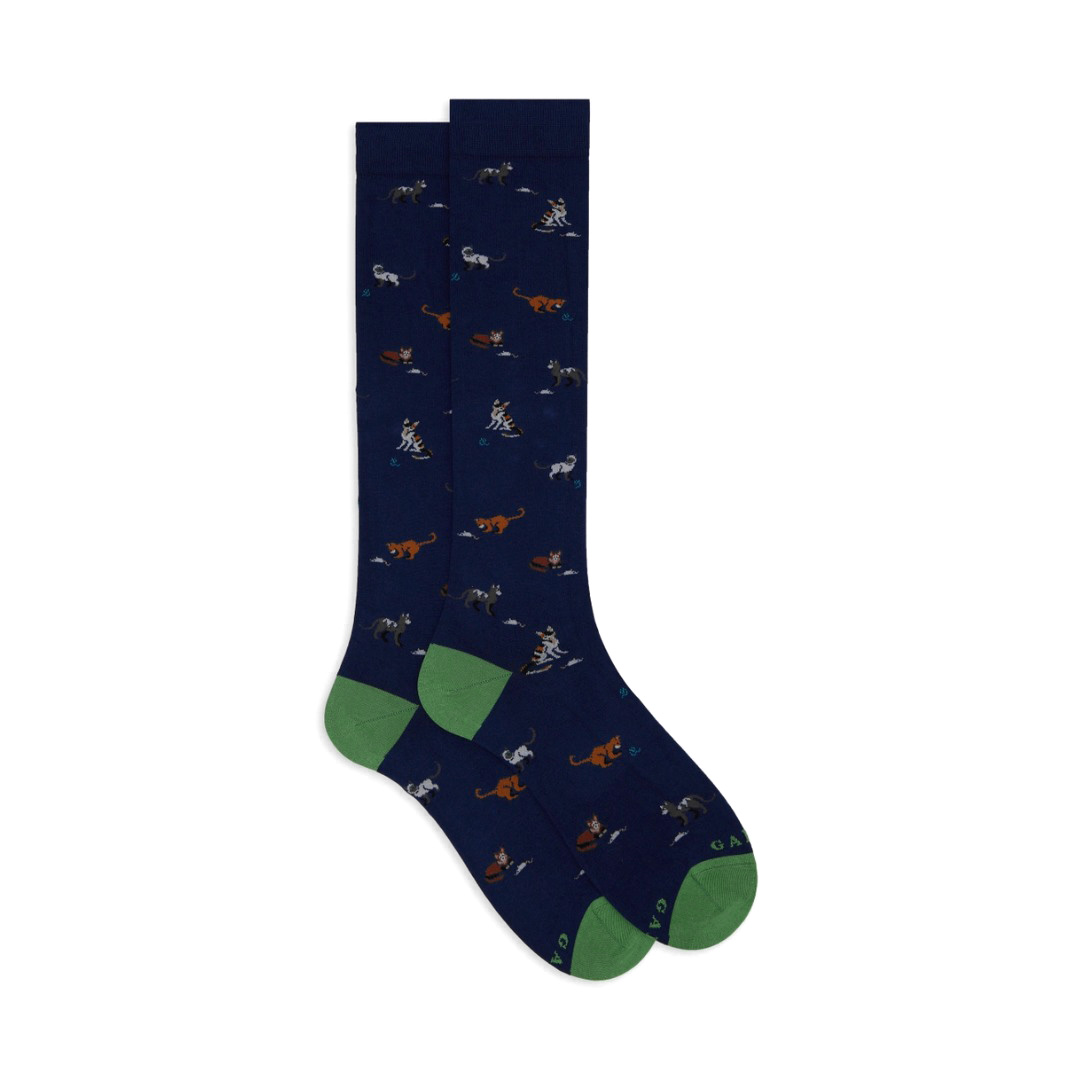 Calze lunghe da uomo in cotone leggerissimo nella tonalità del blu, realizzate in Italia. Molto morbide al tatto, create per chi non rinuncia ad un dettaglio di stile. La fantasia gatti con topolini gomitoli le rende cool e divertenti. Adatte ad un look formale o frizzante. La vestibilità perfetta Gallo, sinonimo di qualità italiana dal 1927.