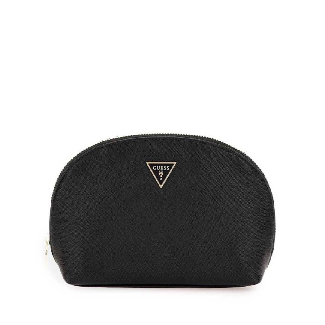 Esterno in materiale sintetico. Chiusura con cerniera lampo. Metalleria color oro pallido. Lavorazione saffiano. Triangolo logo in metallo frontale. Misure 22x6x14 cm.