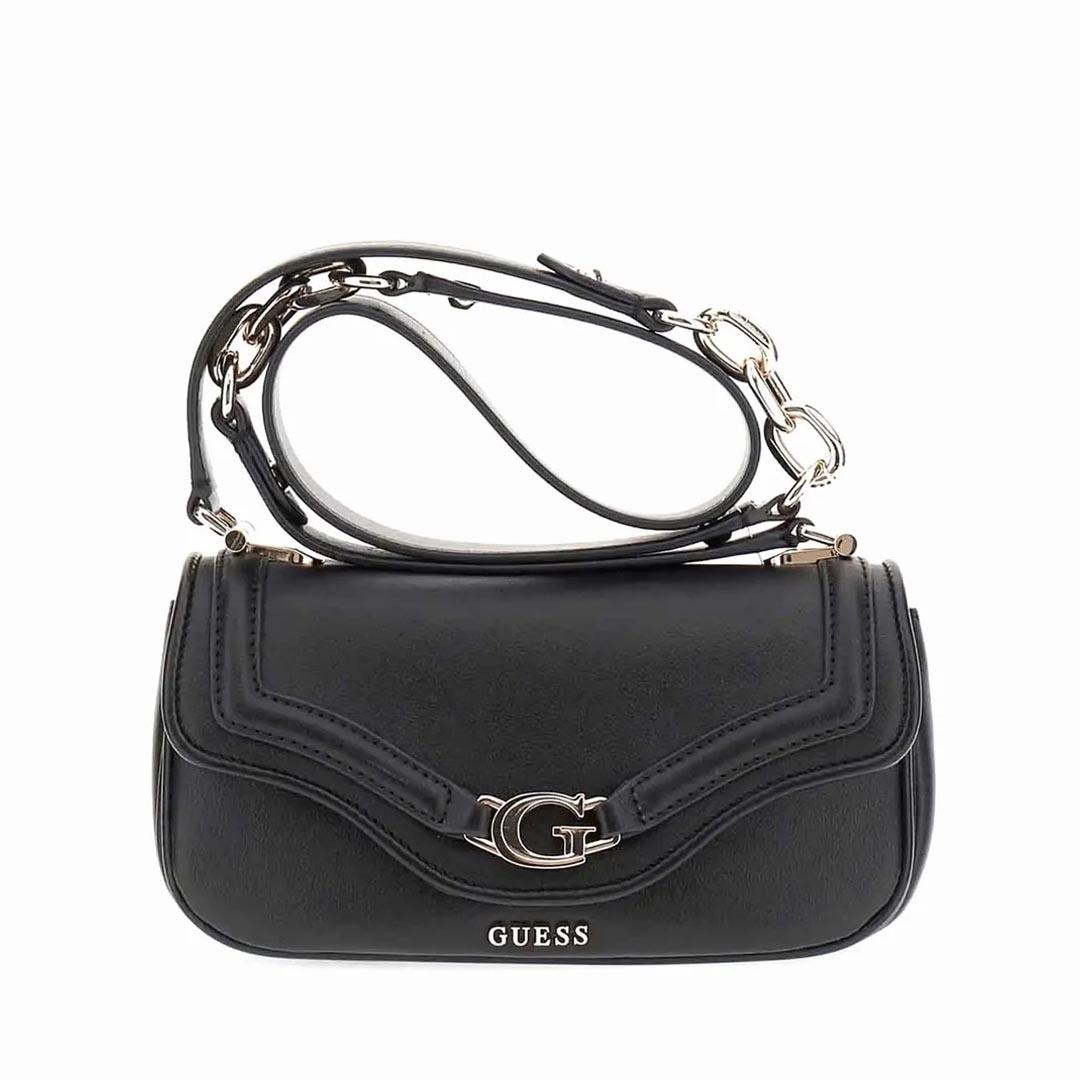 Esterno in simil pelle. Chiusura con patta e doppio bottone. Metalleria color oro pallido. Famiglia:Dea Doppio comparto interno. Scritta logo in metallo frontale. Misure 23 x 12 x 5 cm. Tracolla con dettaglio catena lunghezza ca. 110/130 cm.