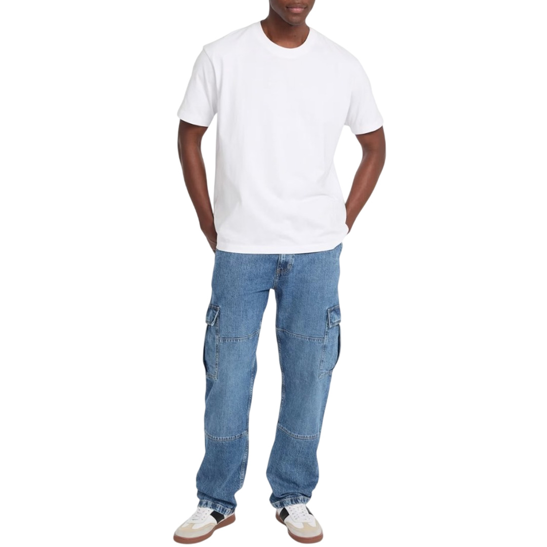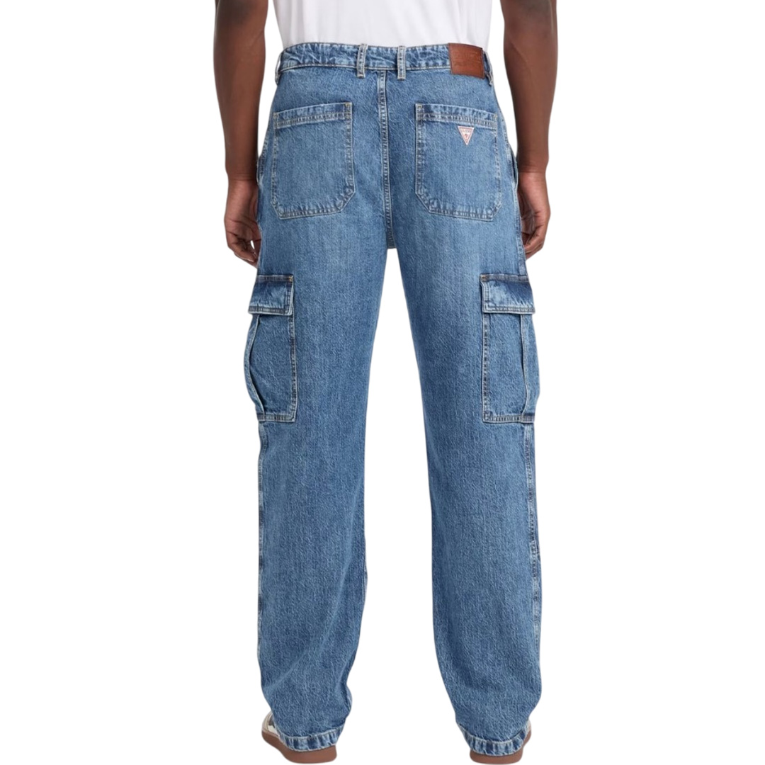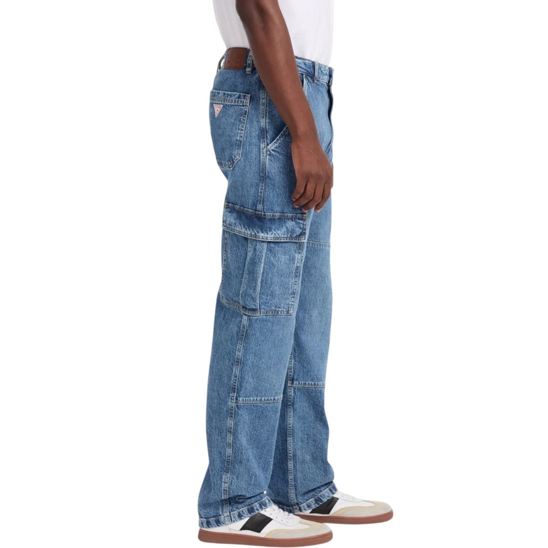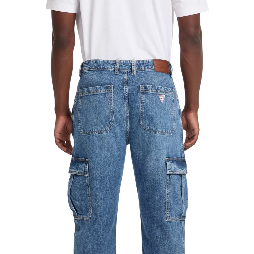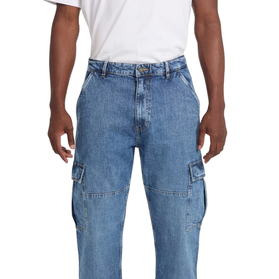 Jeans cargo in denim stretch, lavaggio indaco. Vestibilità relaxed. Vita media, aderente sui fianchi. Tasche cargo. Chiusura con zip e bottone.