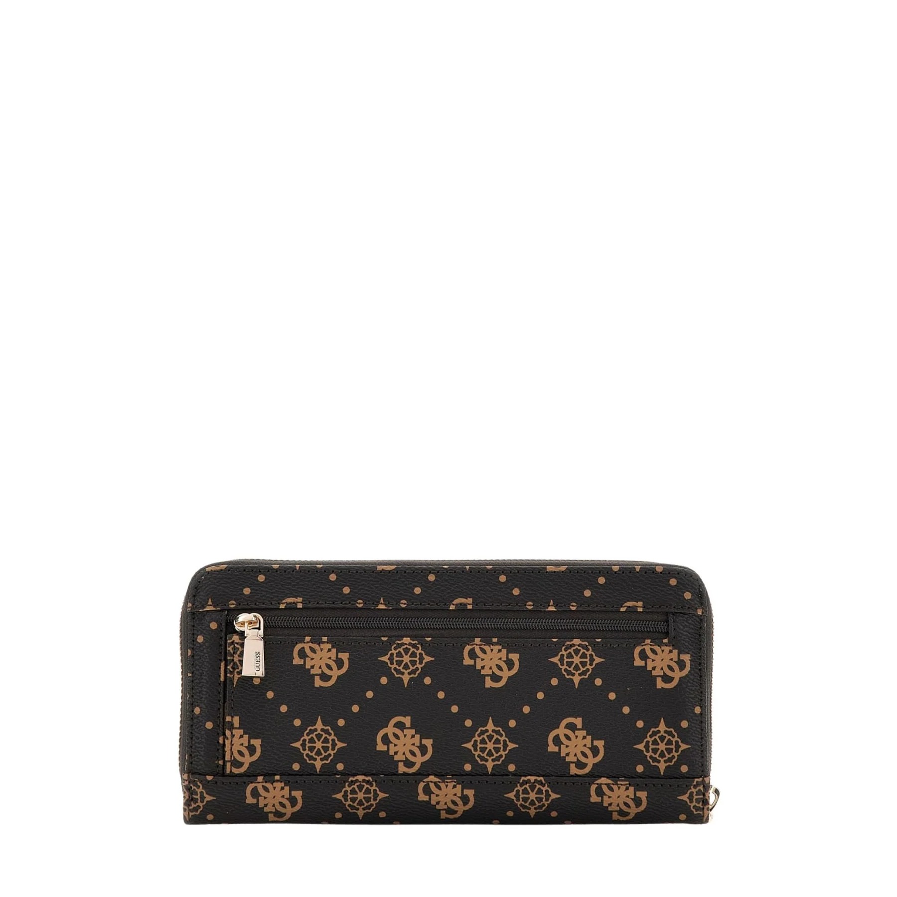 Il portafoglio è realizzato in poliuretano con logo all over e un altro in metallo sul davanti. Presenta laccetto laterale rimovibile, chiusura con zip e tasca con zip sul retro. L'interno è foderato, diviso in scomparti e tasca con zip per monete. Cm 21x10x2