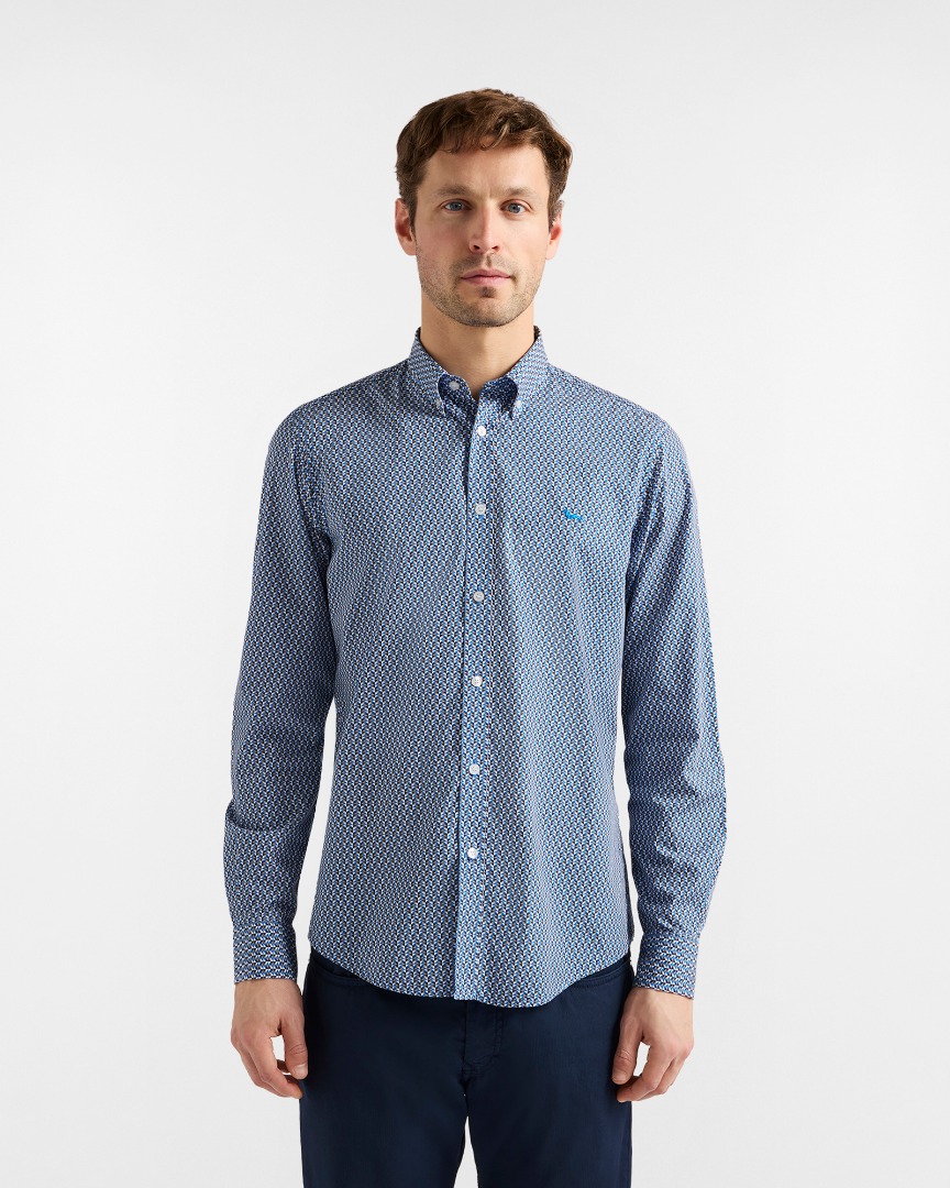 Scopri questa camicia in puro cotone caratterizzata dalla micro stama geometrica che crea un effetto visivo dinamico e moderno. Collo con bottoncini e bassotto ricamato lato cuore, questa camicia è un capo versatile che non può mancare nel tuo guardaroba.