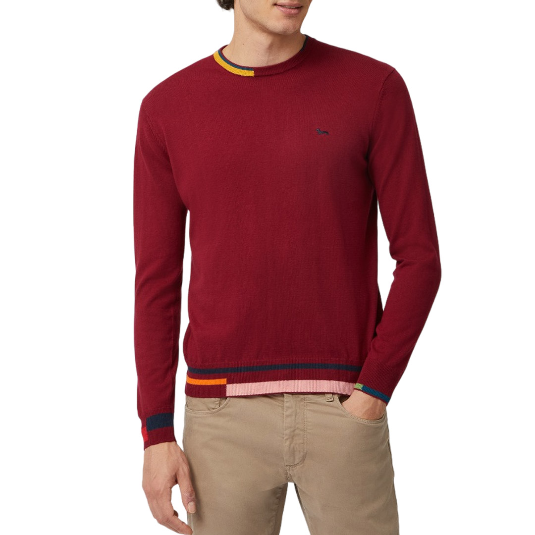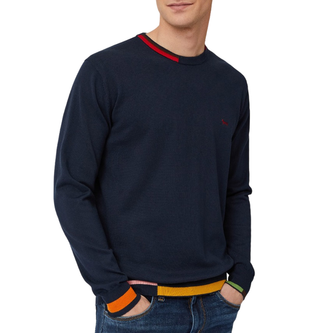 Realizzato in un filato di cotone e lana fresco e al tempo stesso avvolgente, il pullover girocollo da uomo proposto da Harmont & Blaine presenta linee essenziali e una vestibilità regular, ideale per non costringere i movimenti. Il modello è animato da vivaci dettagli color block in corrispondenza dei polsi, del collo e del fondo capo in costina elastica ed è rifinito dall'imprescindibile mascotte del brand: il bassotto Blaine ricamato a contrasto sul petto.