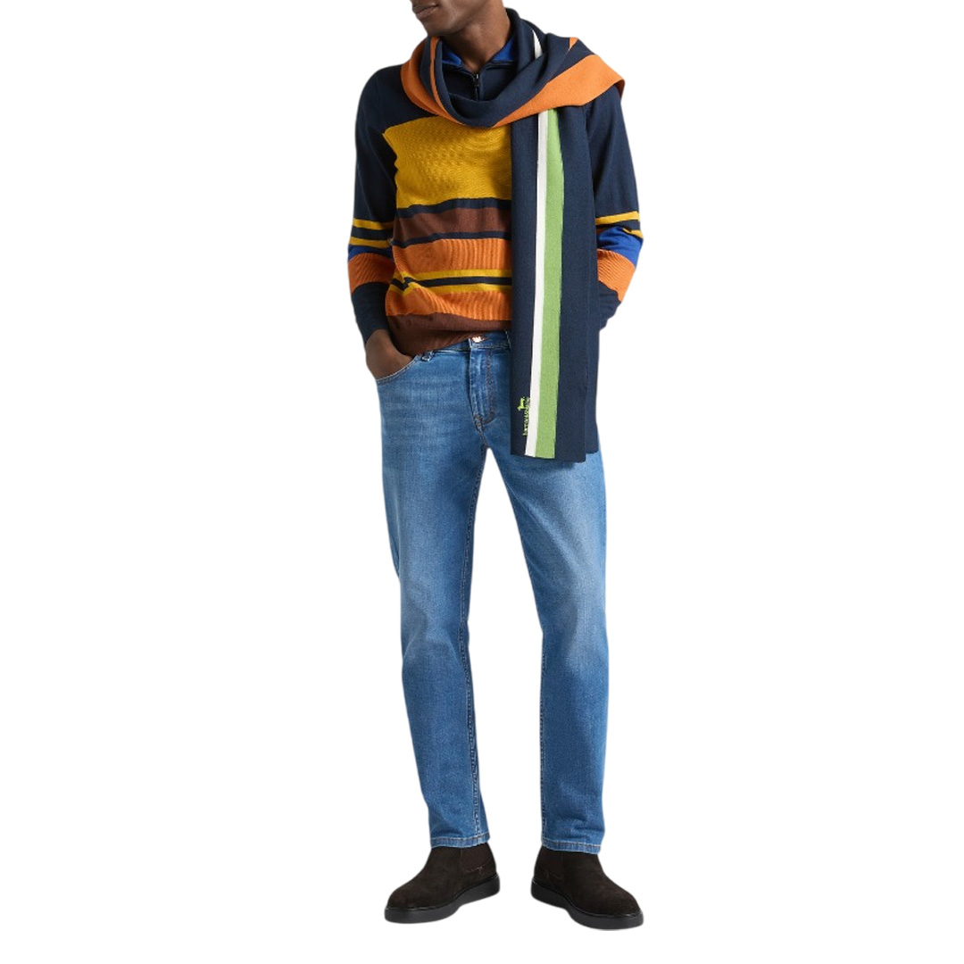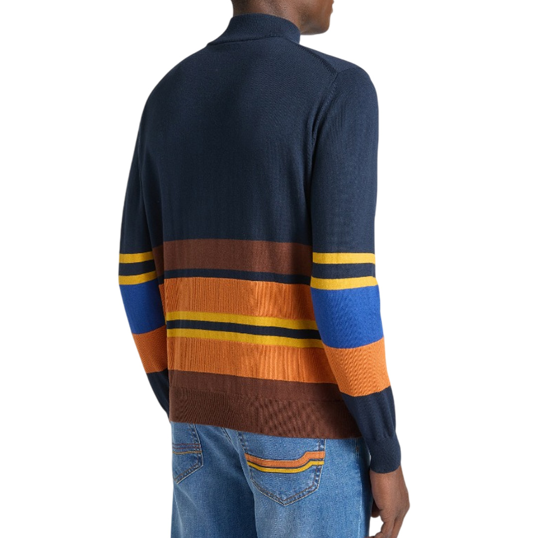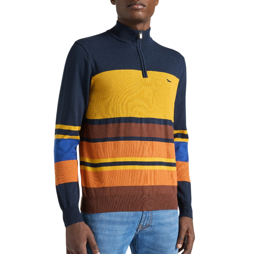 Harmont & Blaine firma un pullover da uomo realizzato in un morbido e confortevole mix di cotone e lana ideale per completare i vostri outfit casual della stagione fredda. Il capo è caratterizzato da un collo in piedi con zip, ed è ravvivato dal tocco di brio tipico del brand: un motivo a righe multicolor di diverso spessore e una lavorazione a costine che coinvolge parte del motivo, collo, polsini e fondo. Il modello, presentato in una confortevole vestibilità regular, è rifinito dal ricamo dell'iconico bassotto sul petto.