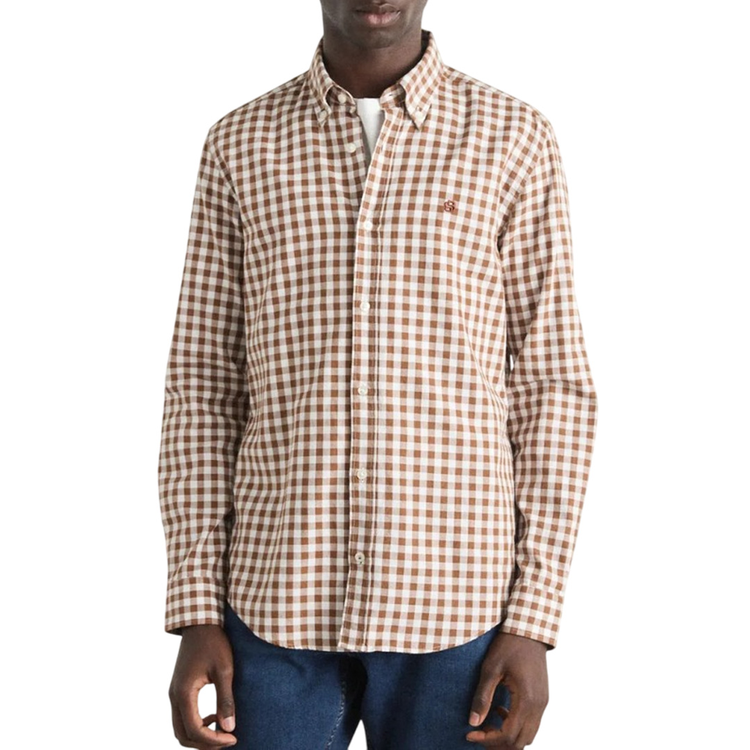 Camicia da uomo a maniche lunghe con bottoni firmata BOSS, caratterizzata dal classico motivo a quadretti vichy marroni e bianchi. Con colletto con bottoni, logo ricamato sul petto e vestibilità aderente