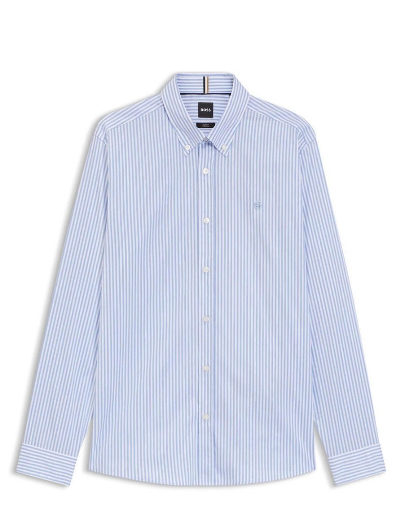 Caratterizzata da righe semplici e monogramma Double B, questa camicia slim BOSS Uomo aggiunge un tocco casual originale. Raso di misto cotone elasticizzato. Questo prodotto contiene almeno il 60% di materie prime di qualità superiore. Questo prodotto è realizzato per almeno il 60% in cotone proveniente da agricoltura rigenerativa. Slim fit Colletto button-down Polsini rotondi