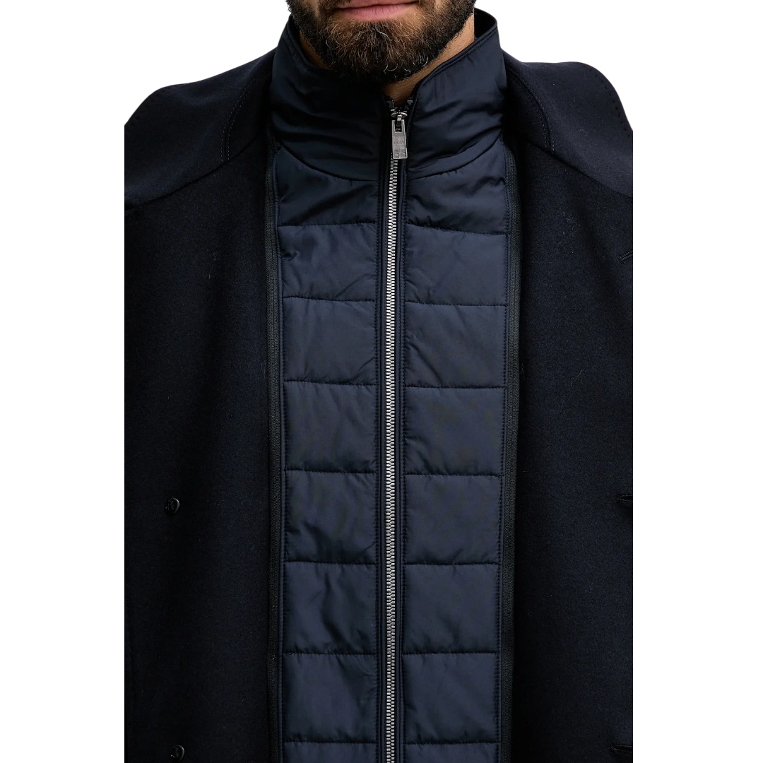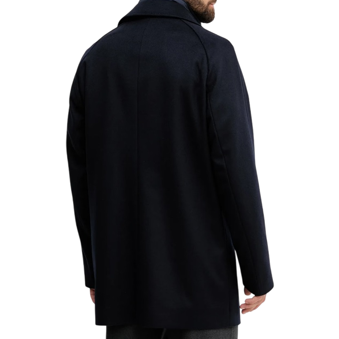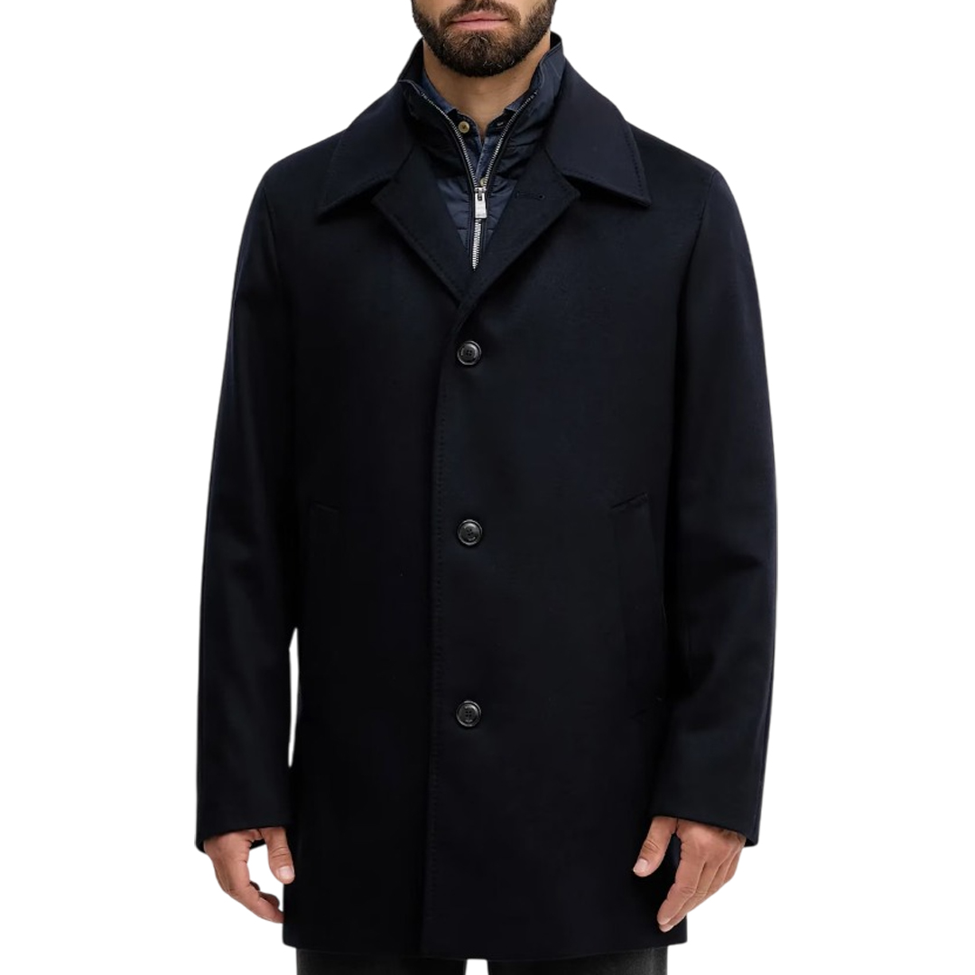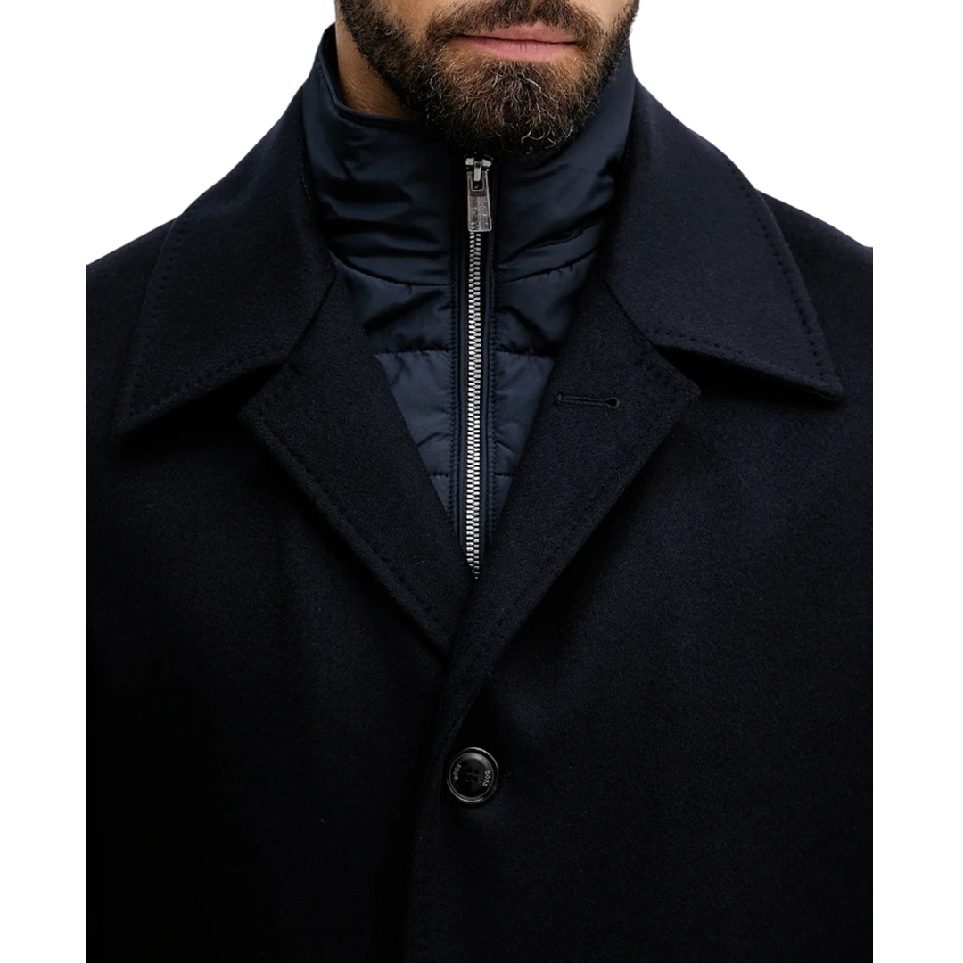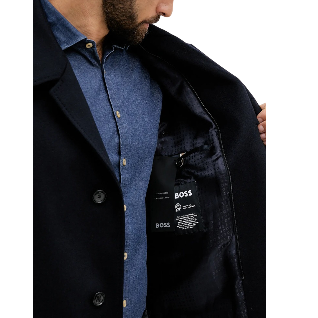 Cappotto Boss in misto lana e cashmere Blu scuro. Rever Classico. Davantino in nylon chiuso con zip. Tasche inserite. Tasche interne. Foderato. Chiusura con bottoni. Slim fit.