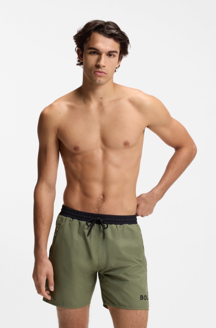 In tessuto ad asciugatura rapida naturale, questi boxer da mare BOSS Uomo presentano un logo e profili a contrasto. Dettaglio con le righe tipiche del marchio sul retro. Questo prodotto contiene almeno l'80% di materie prime di qualità superiore. Questo prodotto è parzialmente realizzato con poliammide riciclato. Banda elastica Cordoncino Tasche davanti in basso: Tasche laterali aperte Tasche dietro in basso: Tasca applicata Media lunghezza