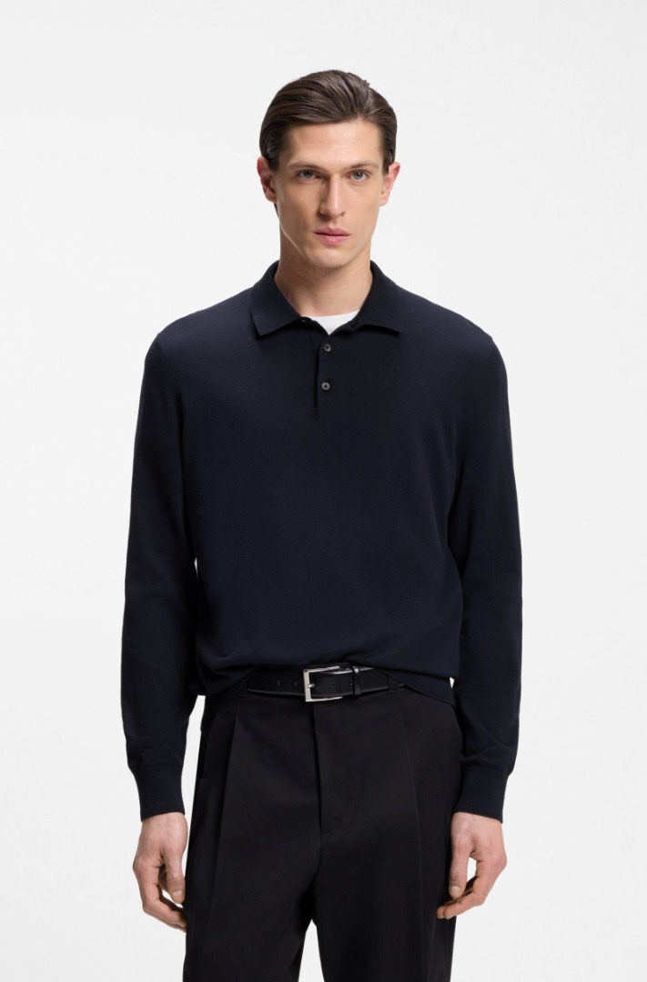 Crea look casual classici con il colletto polo e la maglia di cotone pregiato di questo maglione BOSS Uomo. Vestibilità straight fit. Regular fit Colletto polo Manica lunga Polsini a costine Lunghezza standard