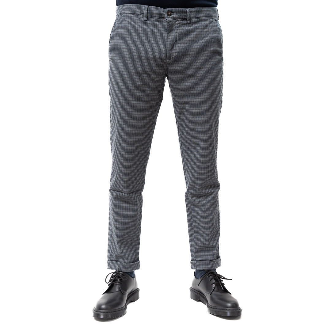 Pantalone chino a fantasia, tasche sul retro con chiusura a bottoncino, vestibilità morbida e regolare, risvolto sul fondo