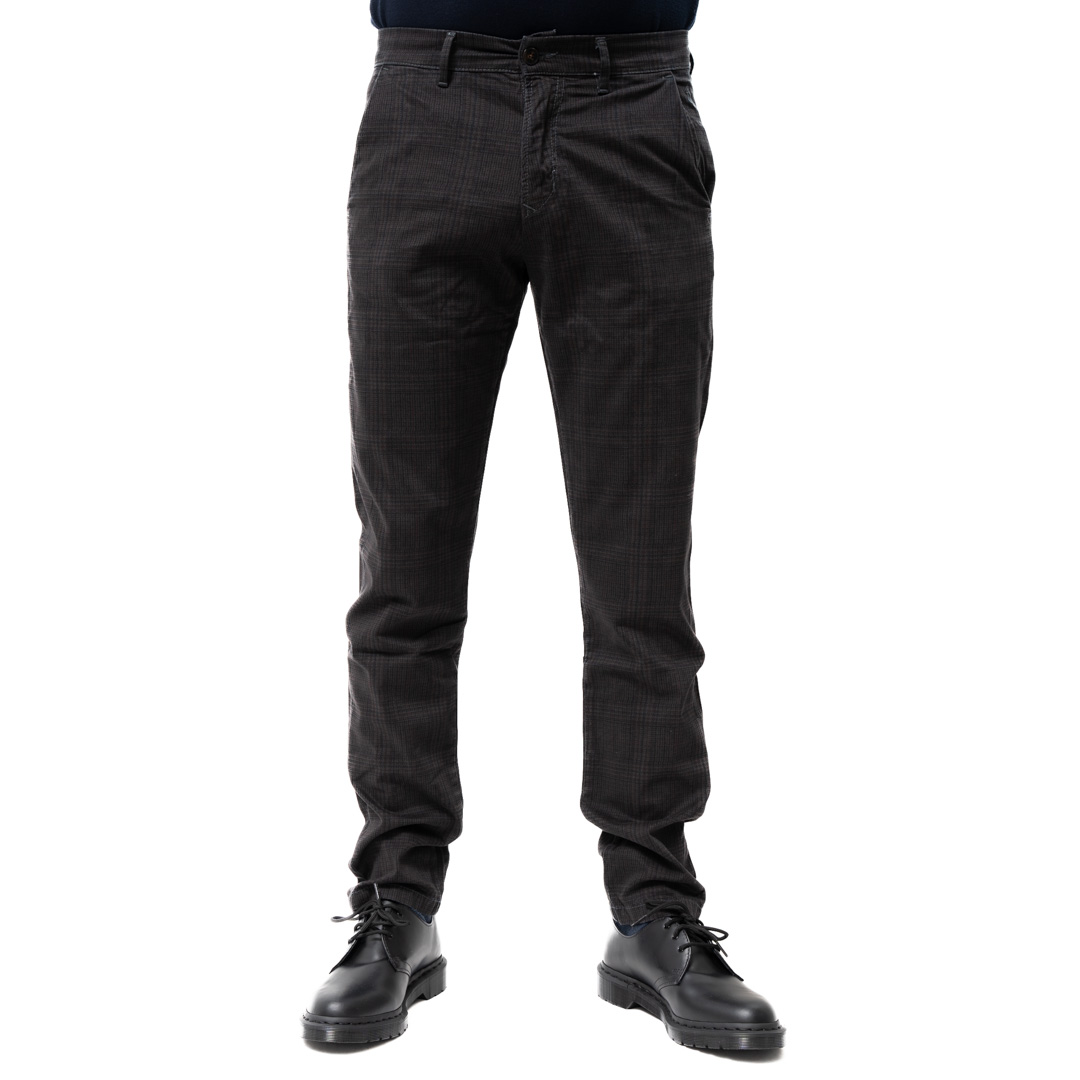 Pantaloni chino. Misto modal e cotone. Principe di Galles. Tasche all’americana. Sul retro: tasche a filetto. Made in Italy.