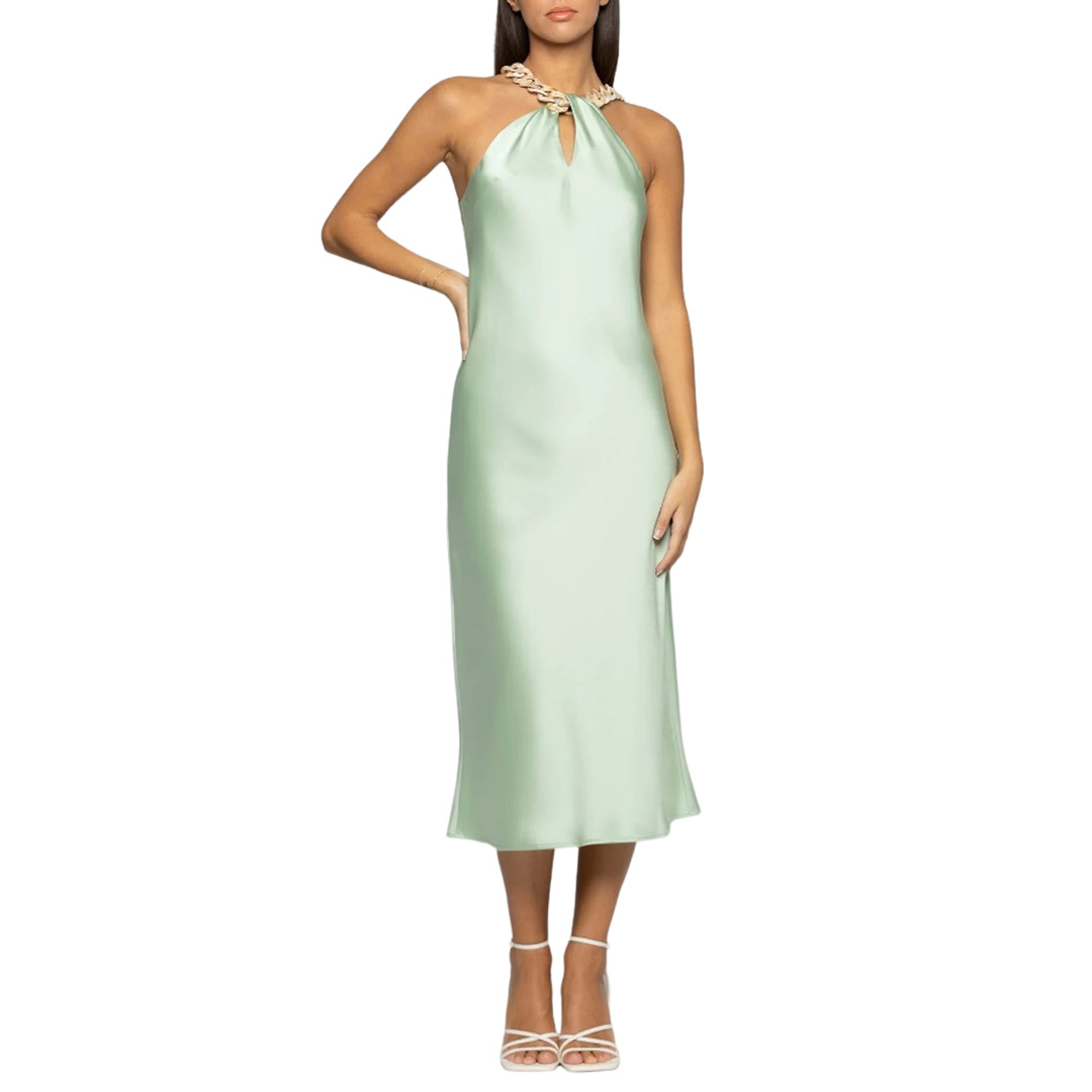 Vestibilità scivolata e drappeggio con catena sullo scollo per questo abito elegante da donna lungo firmato Kocca