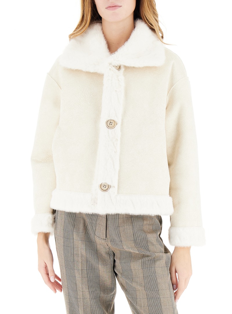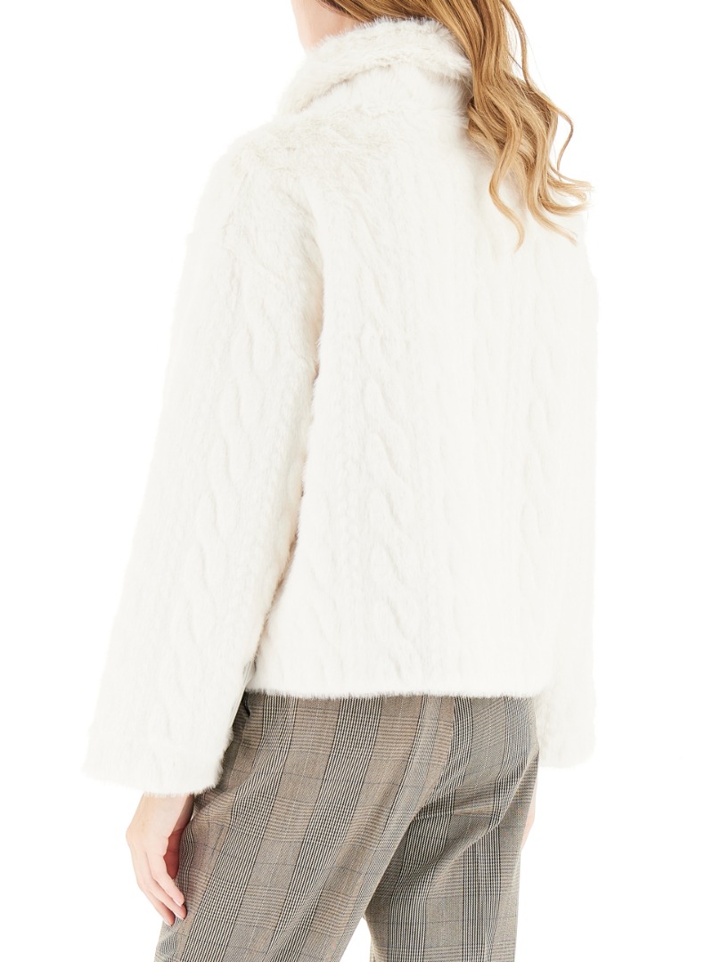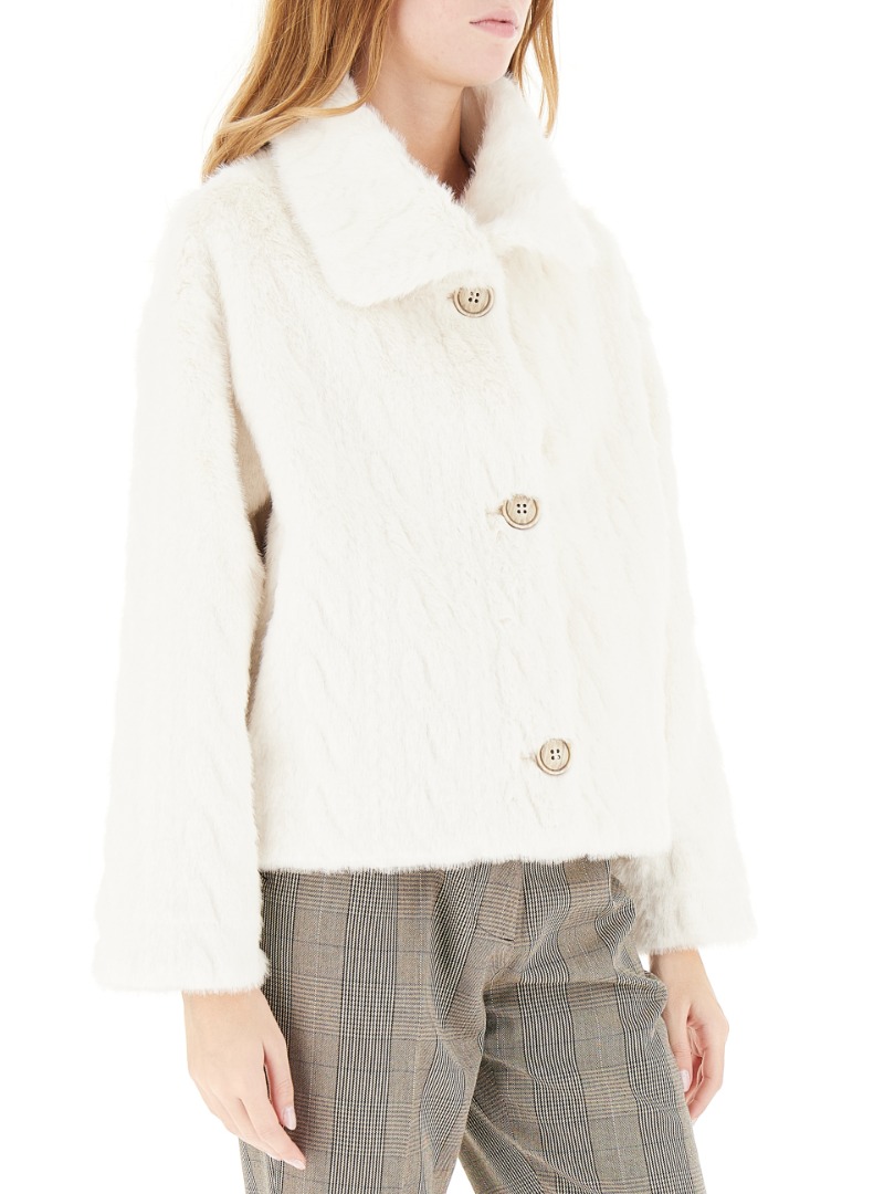 Questo cappotto corto della capsule Pure Verve presenta una fantasia all over a trecce, colletto a punta, maniche leggermente svasate e chiusura con bottoni.