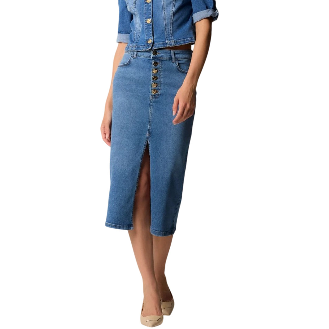 Vita media che slancia la figura e lunghezza midi per questa gonna in denim caratterizzata da spacco frontale, chiusura con bottoni dorati, tasche e fit dritto.