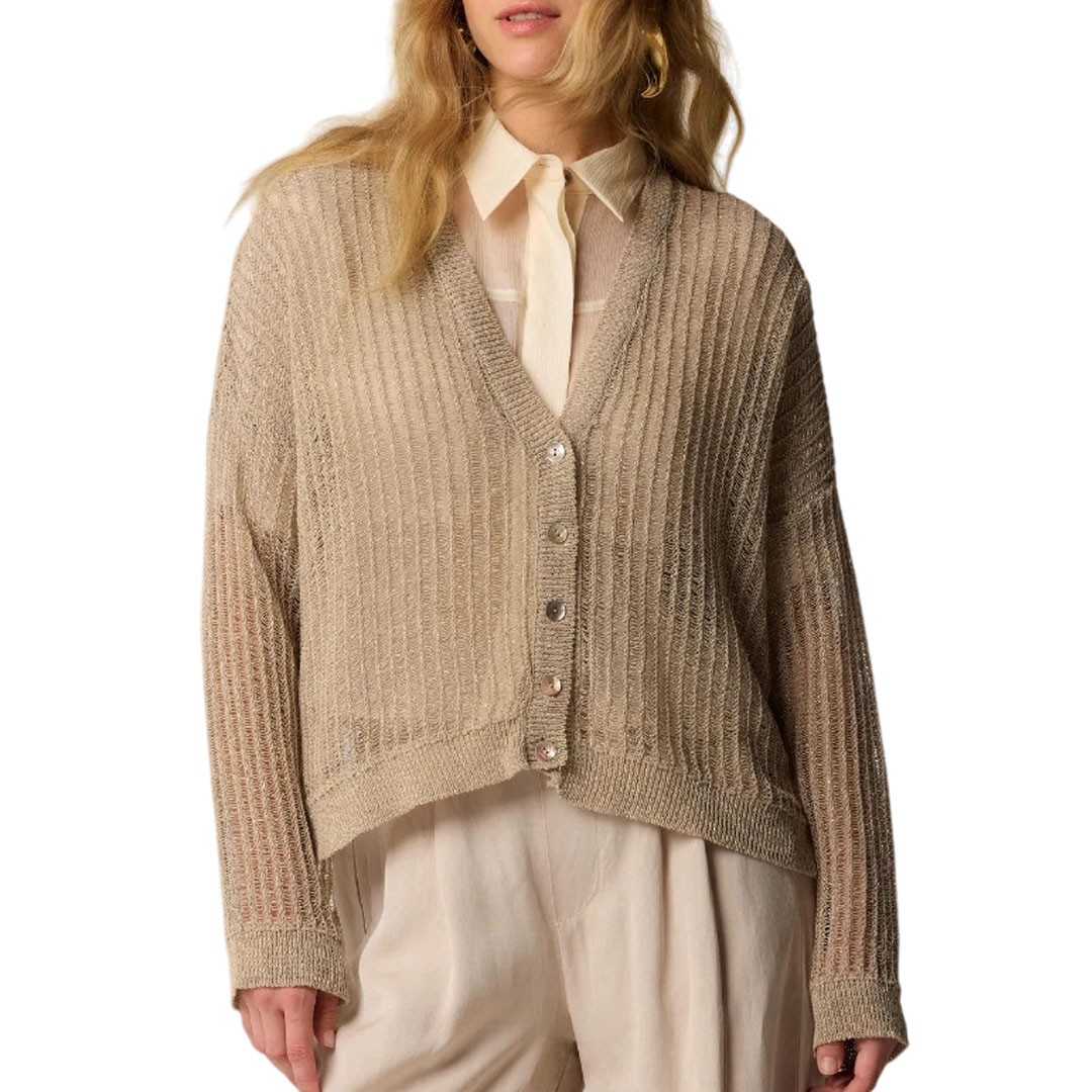 Elegante maglia a maniche lunghe caratterizzata da una lavorazione traforata che regala una raffinata leggerezza al capo. Questo modello presenta una linea asimmetrica e chiusura con bottoni.
