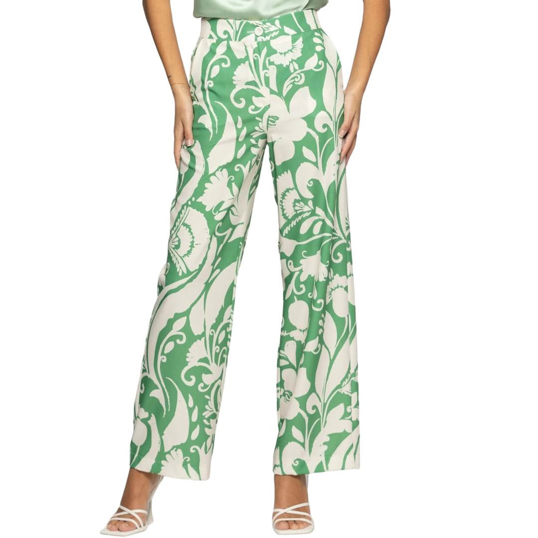 Pantaloni da donna svasati firmati Kocca, caratterizzati da una fantasia floreale bicolor e chiusura con bottone rivestito.