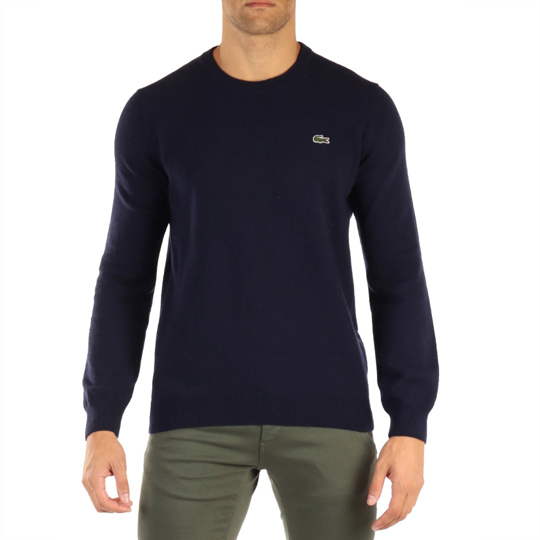 Pullover in filato rasato di misto lana e poliammide, prodotto con fibre sostenibili, regular fit a manica lunga, con girocollo polsini e cannolè in maglia a costine e piccolo monogramma ricamato a filo nei colori istituzionali patch sul petto
