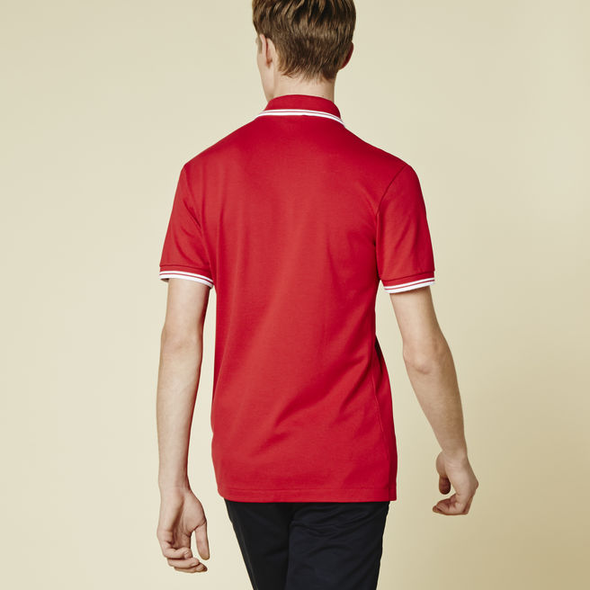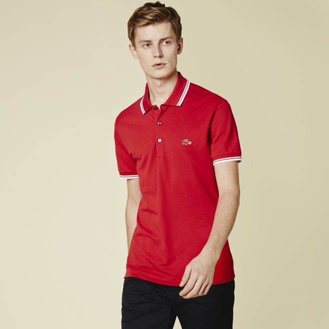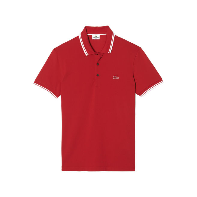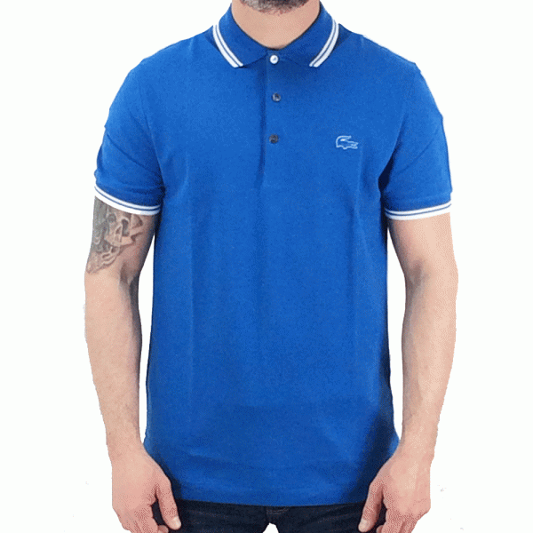 Polo in piquet Lacoste tre bottoni, mezza manica, logo in gomma lato cuore, collo e fondo manica è presente il bordino in contrasto. Vestibilità slim