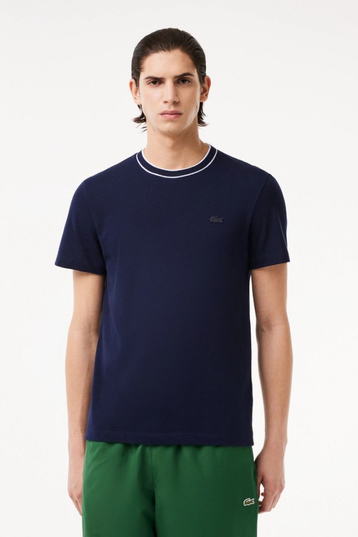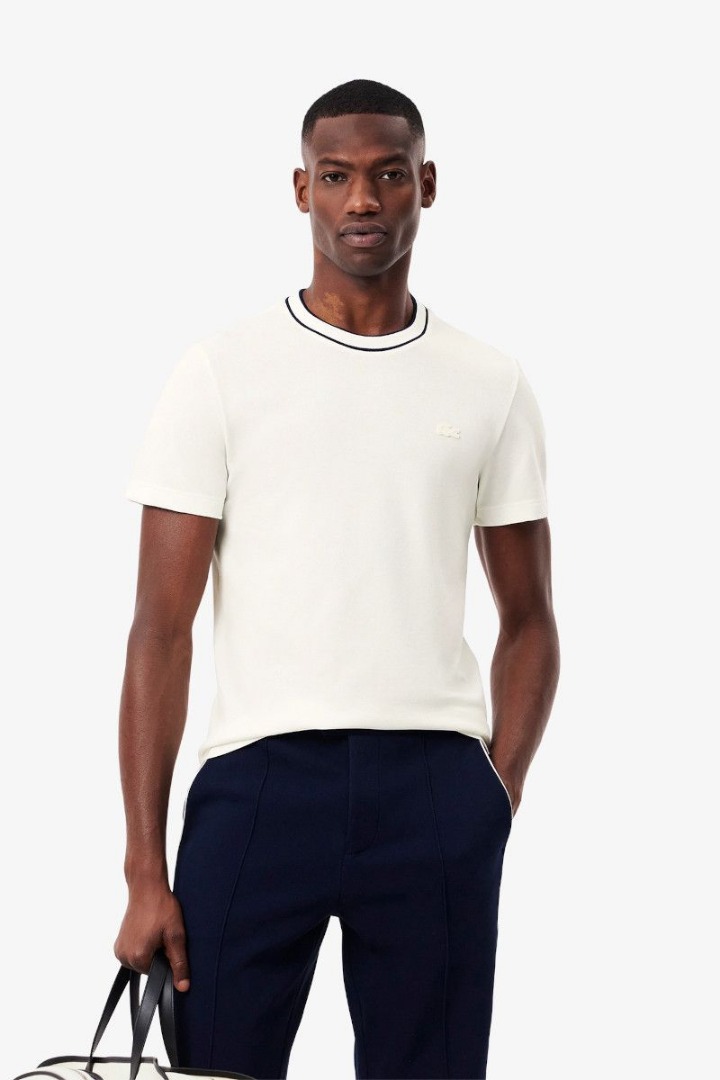 T-shirt Uomo in cotone, regular stile dritto con girocollo lavorato a costine e caratterizzato da un dettaglio stripes in contrasto, personalizzato dal inconico ricamo coccodrillo logato applicato sul petto