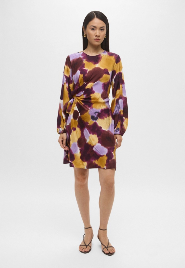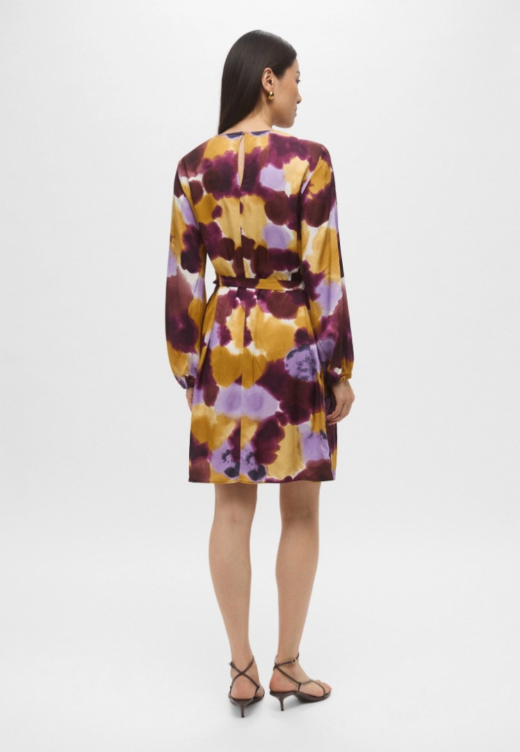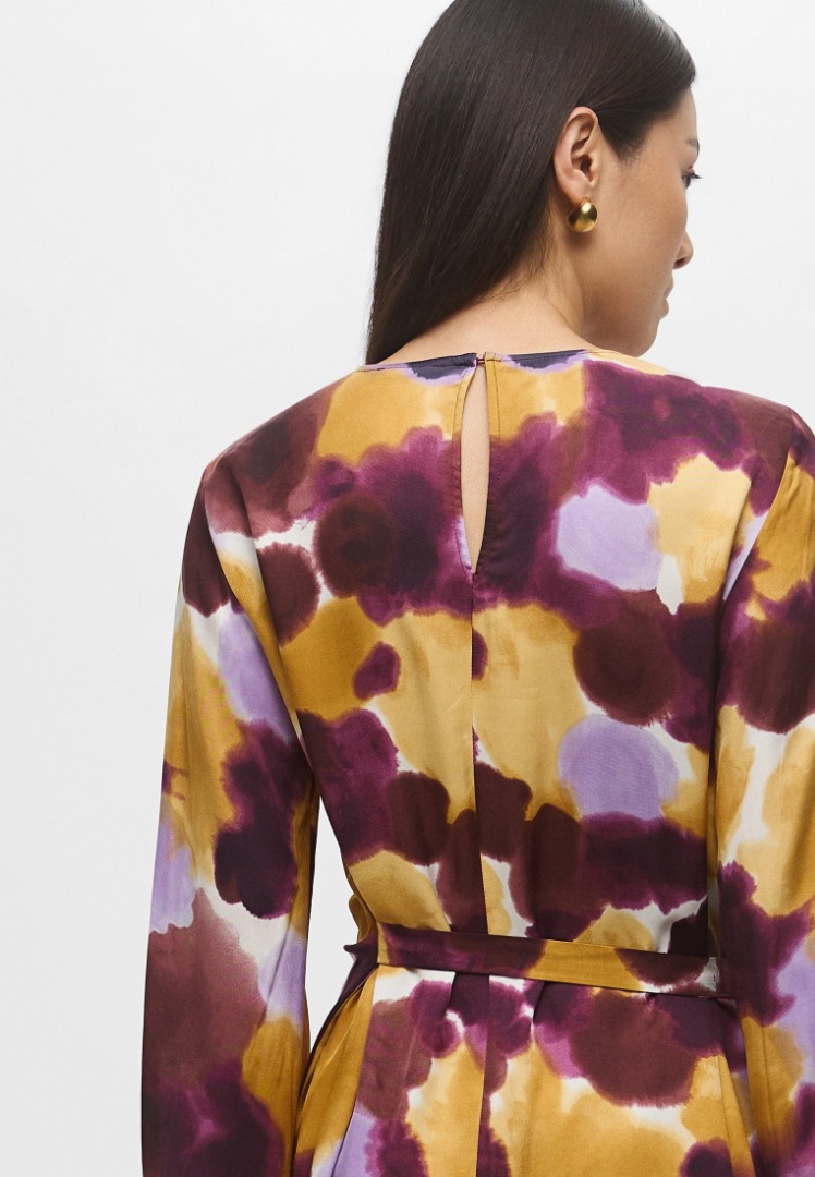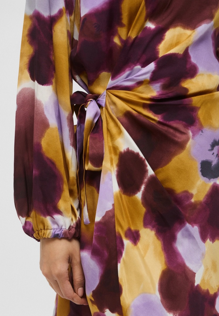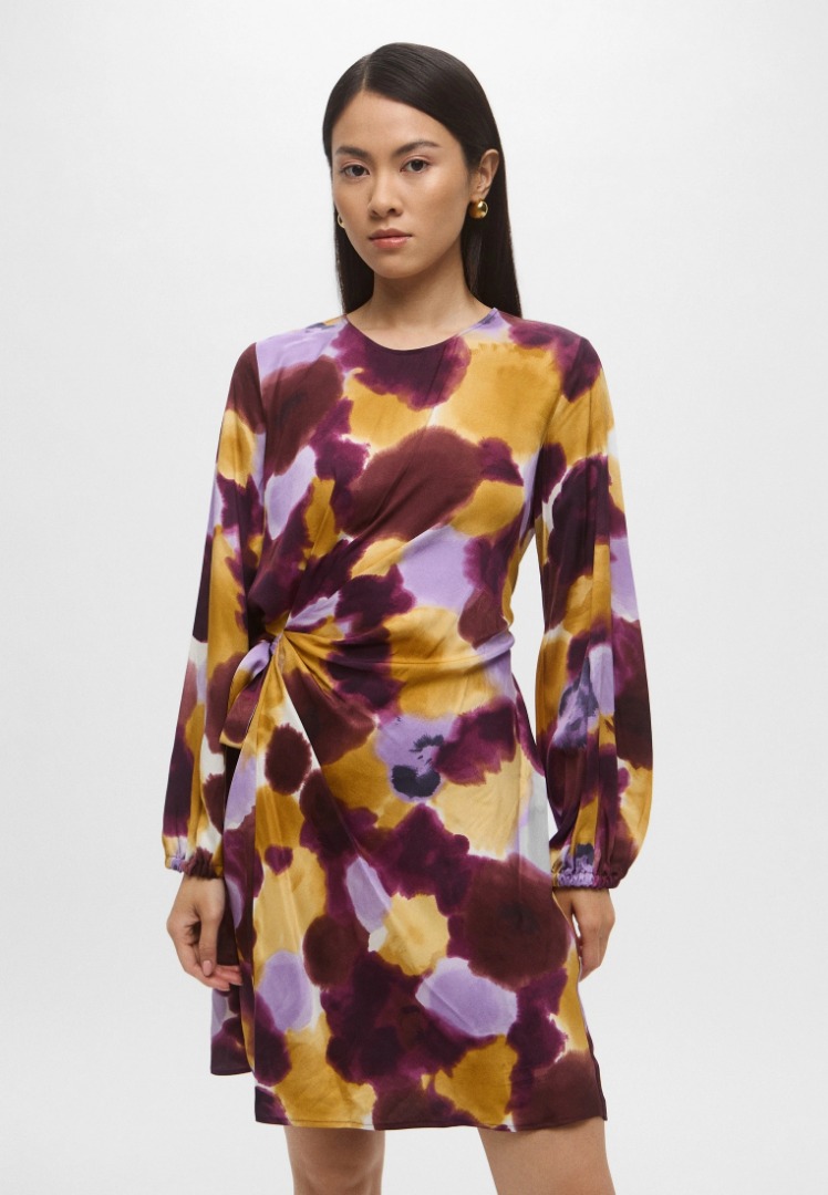 Nuova interpretazione del wrap dress, con fusciacca che si annoda lateralmente e disegna la silhouette. Lunghezza sopra il ginocchio Abito in twill di viscosa stampata Fit femminile sfiancato in vita Scollo a giro con apertura posteriore a goccia Maniche lunghe con arriccio e inserto elastico al polso Gonna ampia con si stringe lateralmente con fusciacca