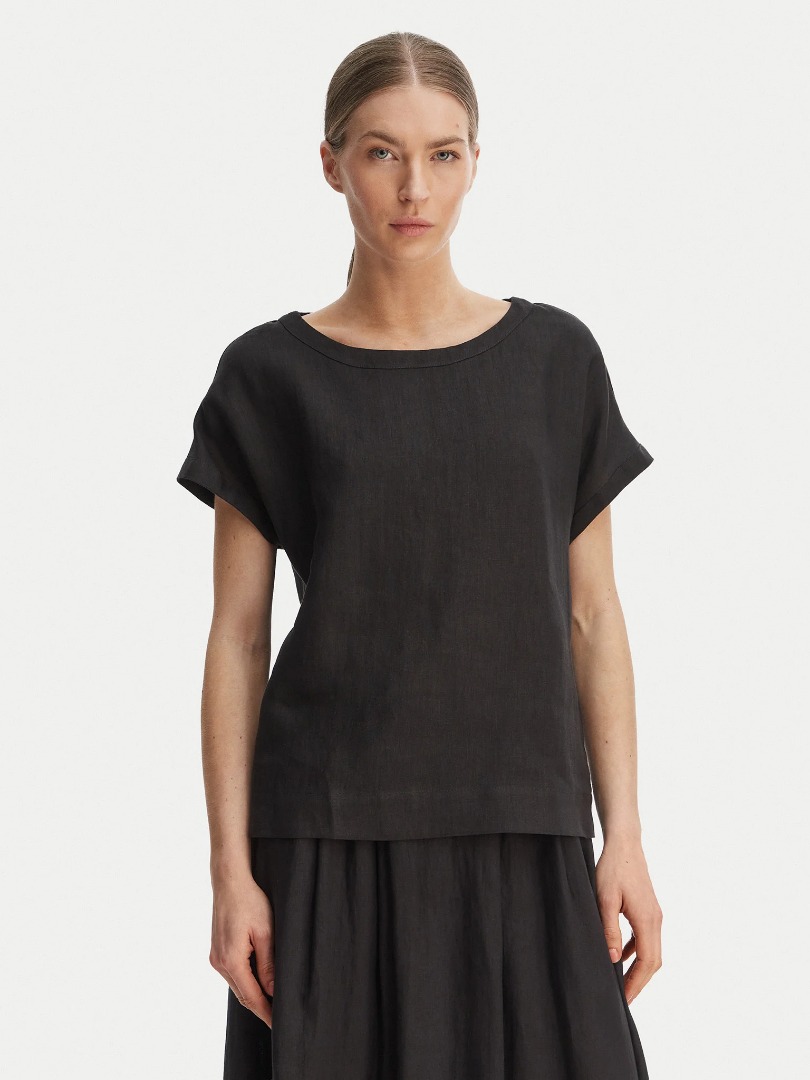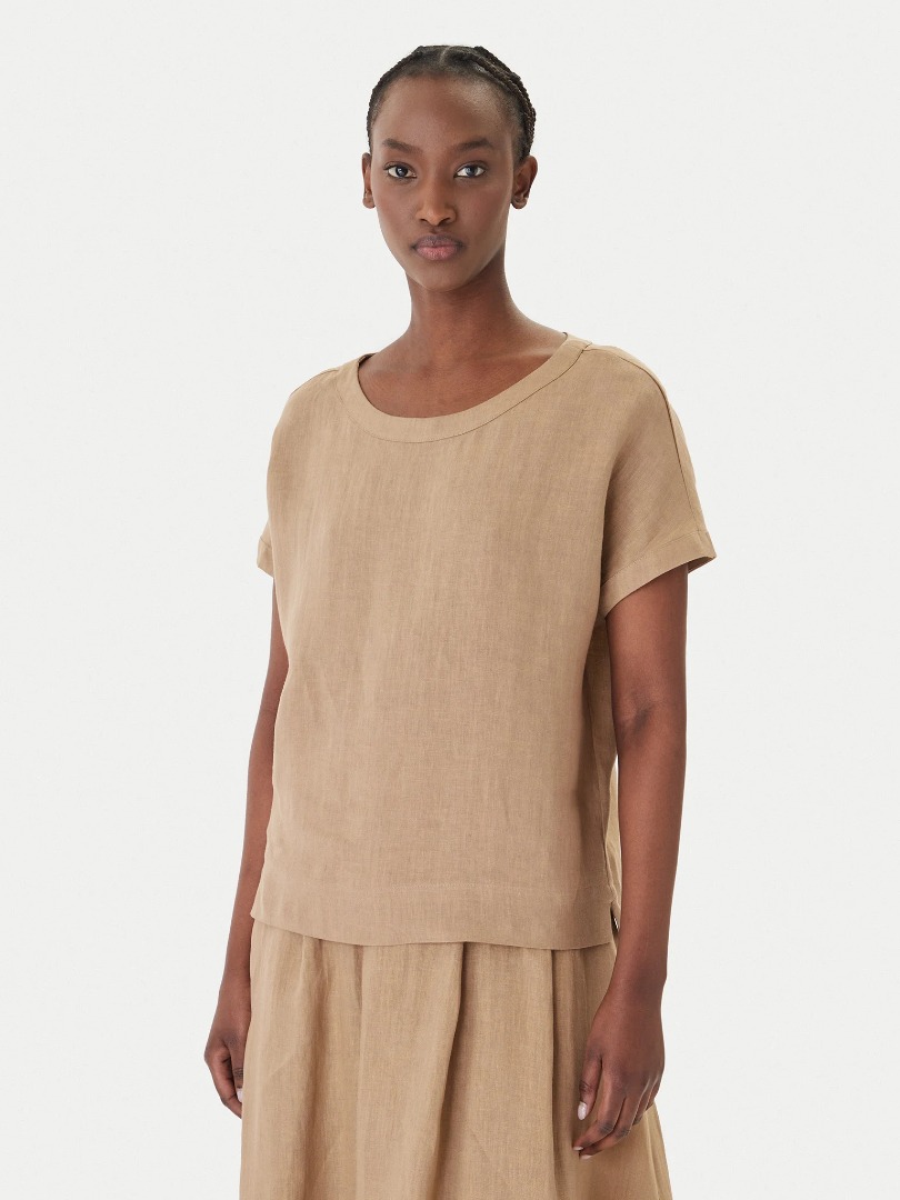 Blusa in tela di puro lino lavato Fit regolare Scollo a barchetta Maniche corte con linea a kimono Bordi alti su scollo e fondo manica