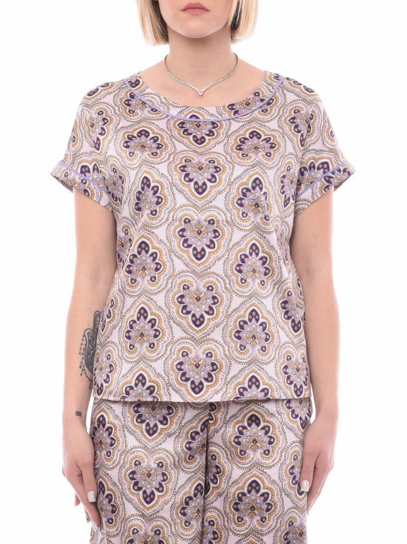 Blusa in twill a fantasia, linea morbida. Scollo a barchetta, maniche corte a kimono.