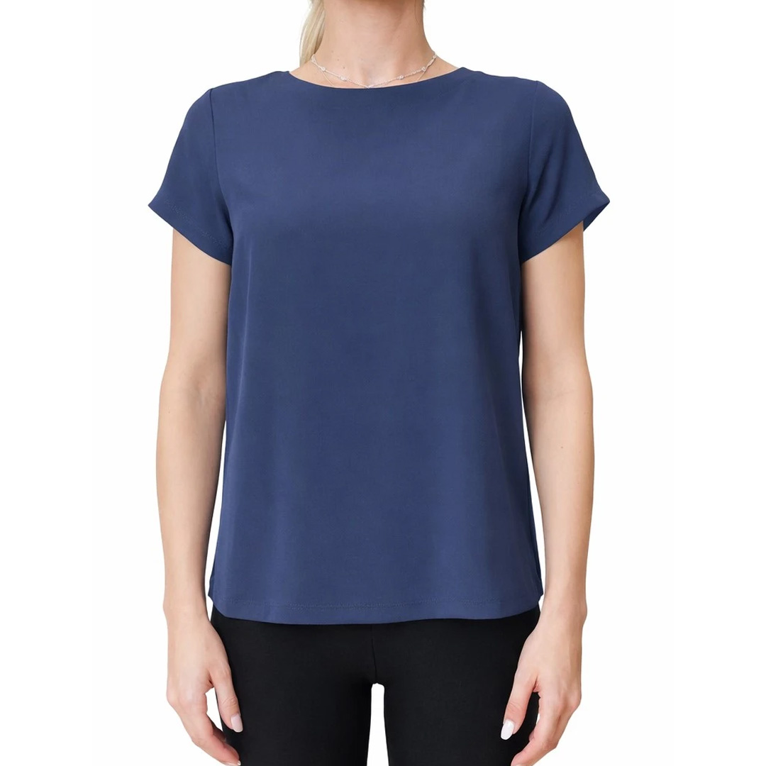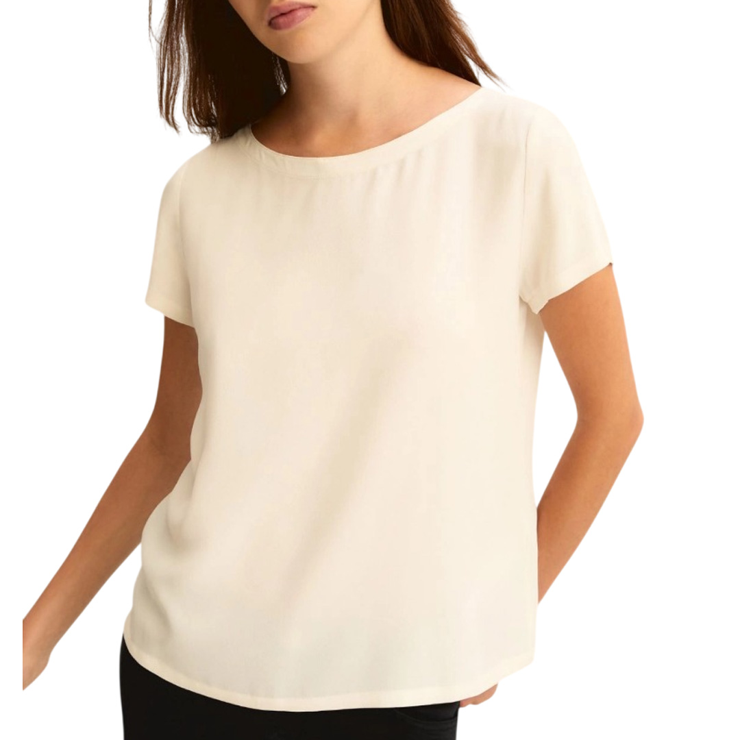 Blusa versatile ed elegante, in crêpe de Chine di misto seta per una nota preziosa sulla pelle. Con manica corta e collo a barchetta ispirato alle marinière anni '80. Tessuto principale contenente materie prime derivanti dalla cellulosa del legno, fibra ricavata nel rispetto del patrimonio forestale Blusa in crêpe de Chine di misto seta Fit regolare Scollo a barchetta Manica corta