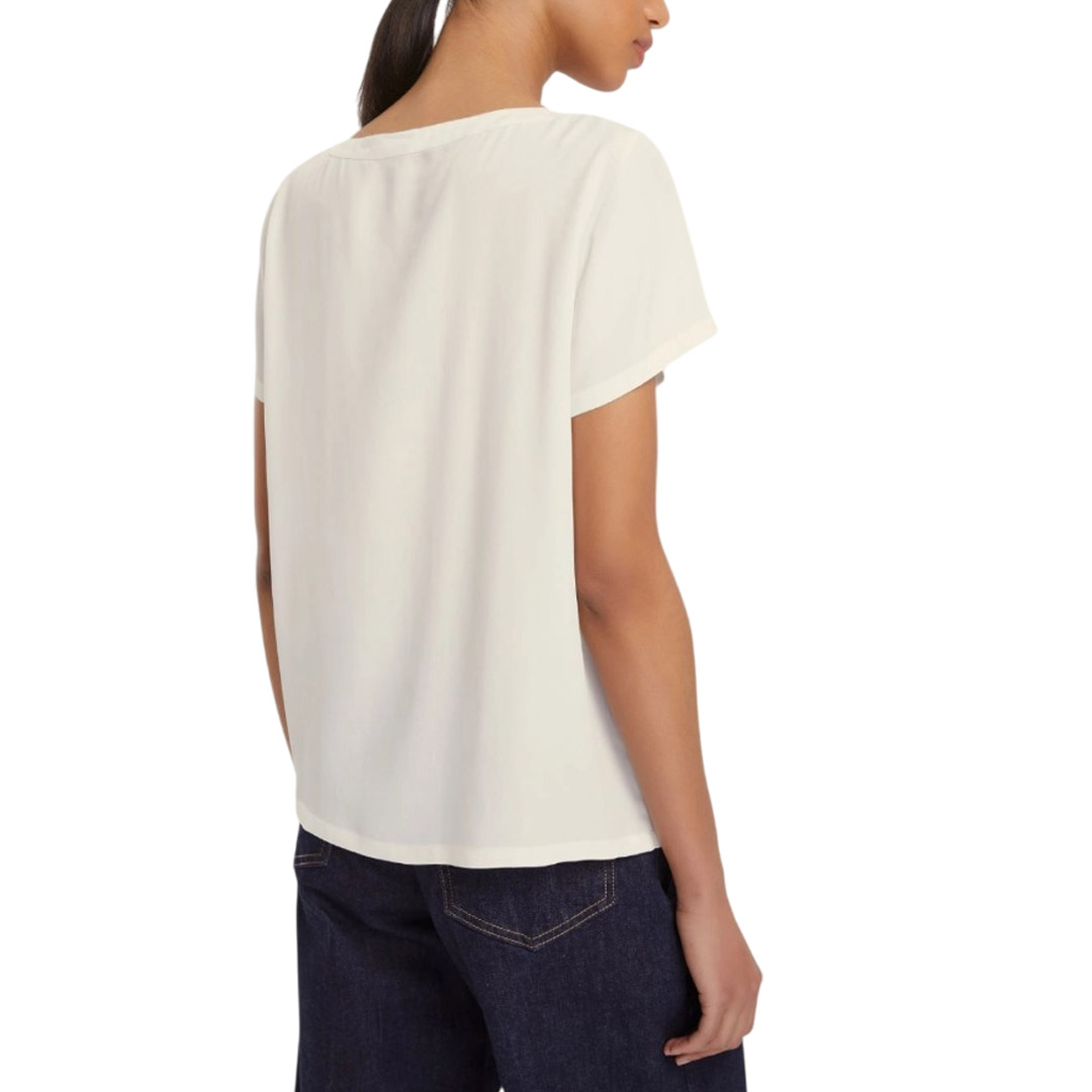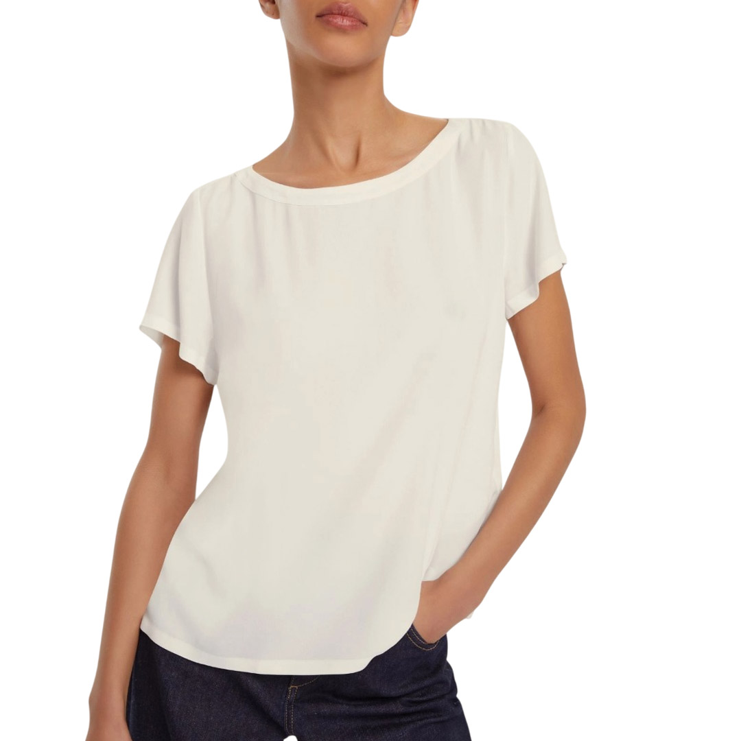 Linee semplici e una preziosa crêpe de Chine di misto seta trasformano questa blusa in un vero passe partout di stagione. Abbinala a blazer o pants sartoriali per un city look fresco, o ai denim preferiti per i momenti più conviviali. Blusa in crêpe de Chine di misto seta Fit dritto e morbido Scollo stondato Maniche corte