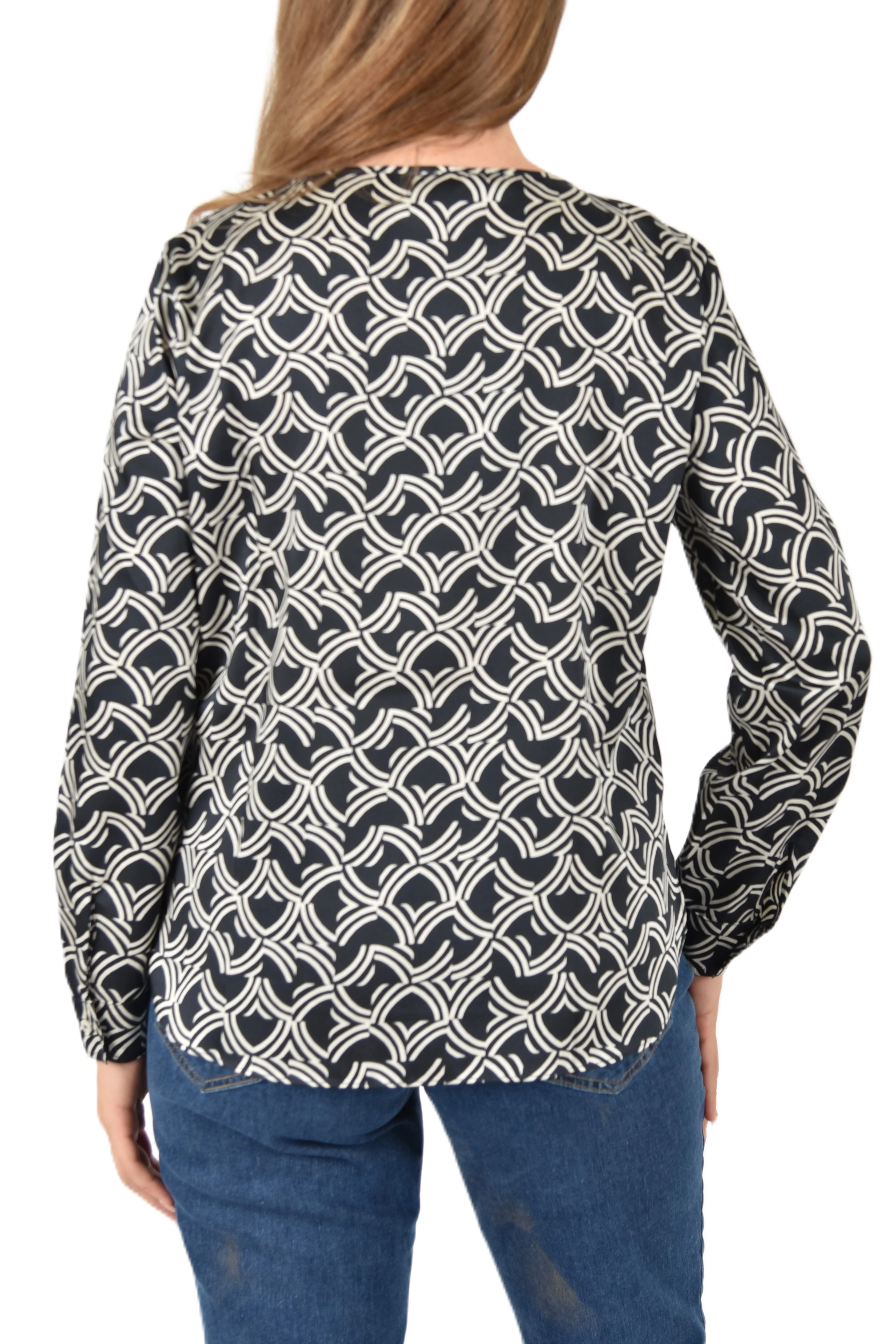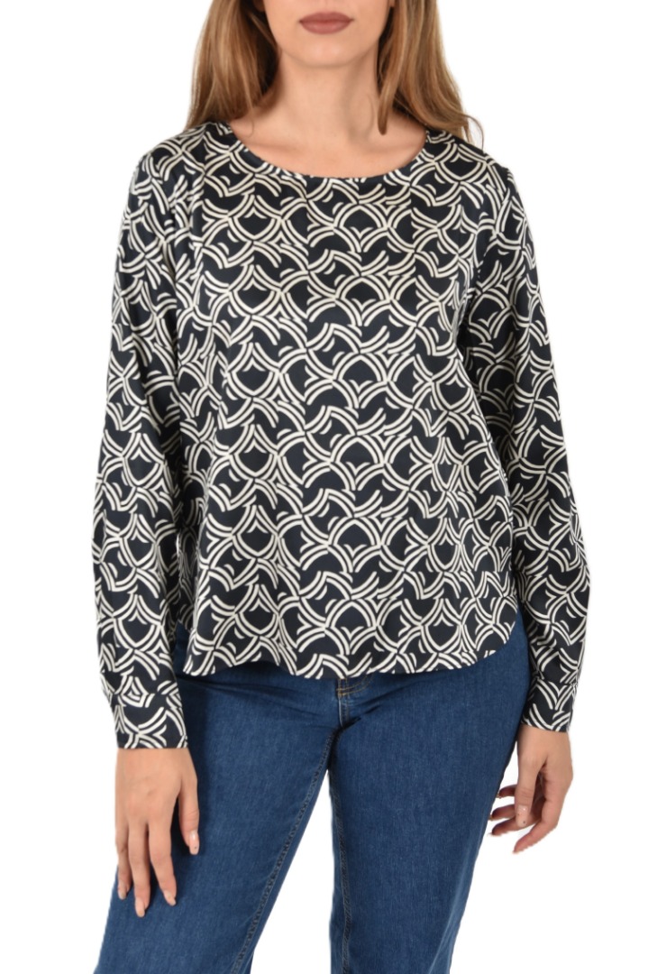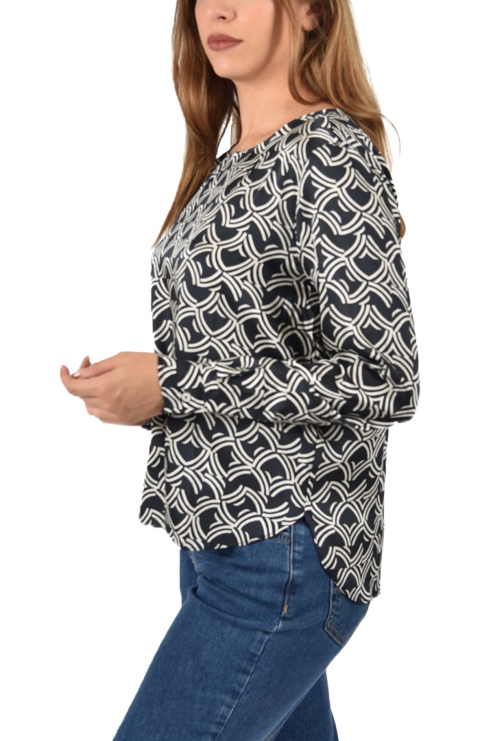 Blusa in twill tecnico stampato dalla linea dritta, luminosa e scivolata. Lo scollo a barchetta e le maniche lunghe con bottone al polso aggiungono un tocco femminile, mentre il fondo stondato e asimmetrico regala movimento ed eleganza discreta. Fit dritto Scollo a barchetta Maniche lunghe con bottone al polso Fondo stondato e asimmetrico con spacchetti laterali