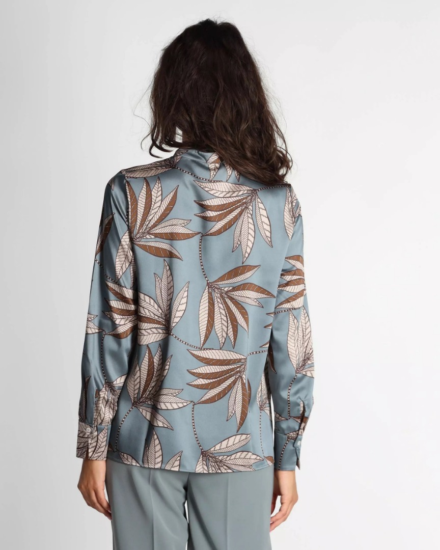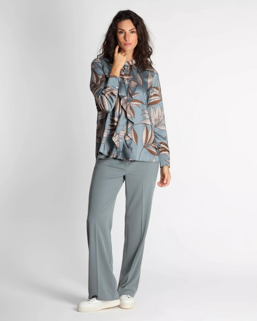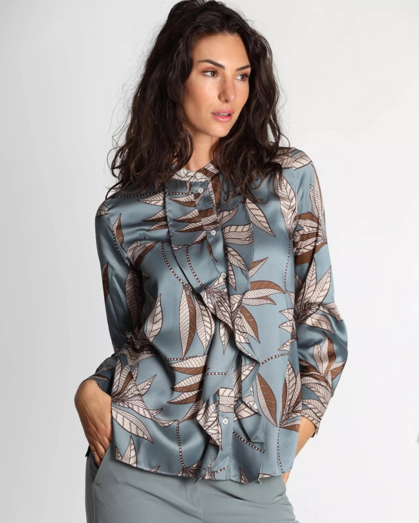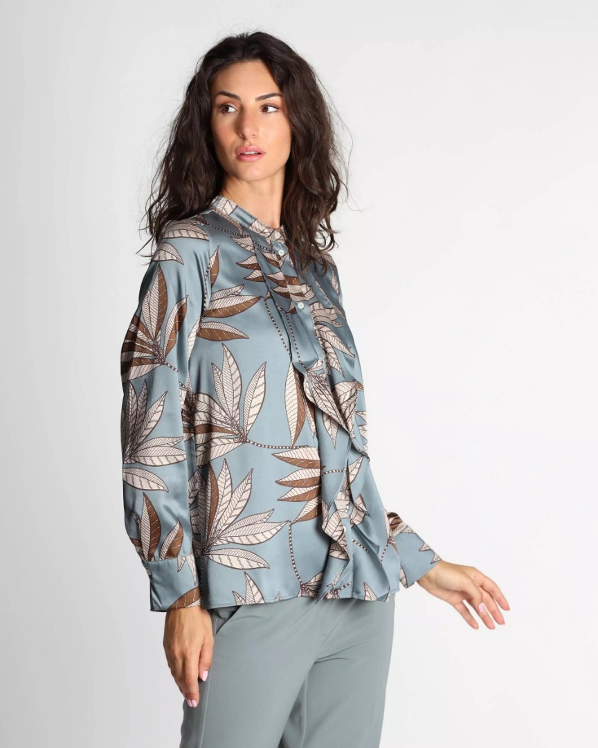Ampi foliage e il tocco romantico dei volant sul davanti trasformano questa camicia in un nuovo must di stagione. Perfetta sotto un impermeabile e con i denim. Tessuto principale contenente una percentuale di poliestere riciclato superiore al 50% Camicia in tessuto tecnico stampato Fit dritto Collo alla coreana con abbottonatura a vista Motivo di piccoli volant sul davanti Polso con bottone e piccolo sbuffo