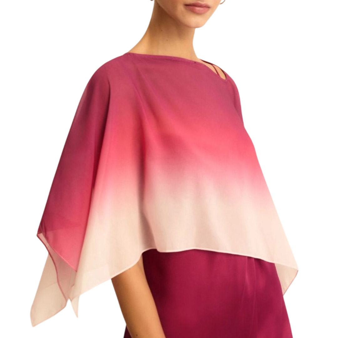 L'eleganza naturale della georgette, la costruzione sofisticata con apertura per lo scollo. La nuova cappa è pensata per completare con raffinatezza le tue mise più importanti. Dalle serate speciali alle cerimonie. Cappa in georgette crêpe Linea rettangolare con apertura per lo scollo asimmetrica Fantasia dégradé