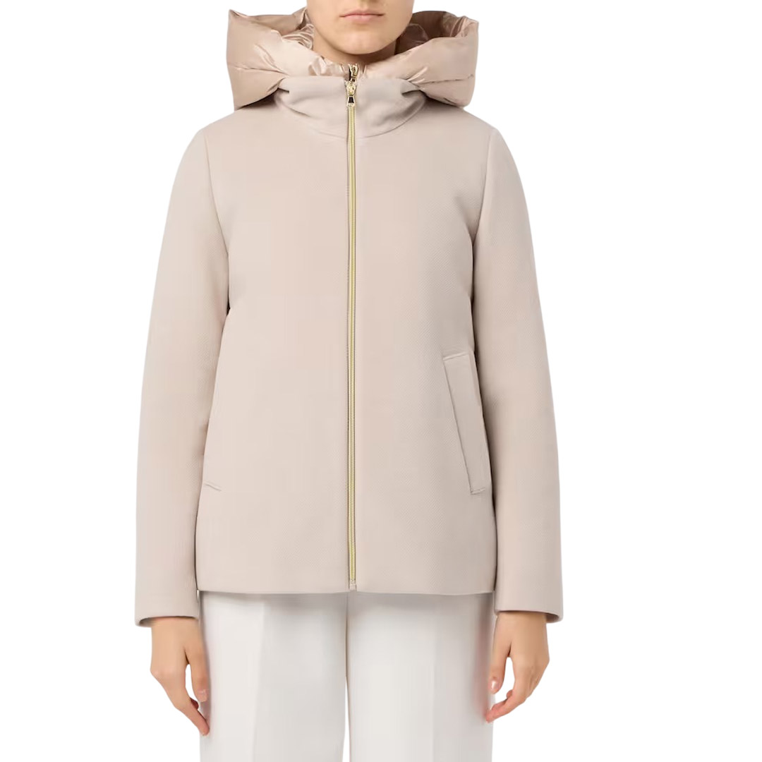 Compatto e trasformabile, questo giaccone in panno soft coniuga funzionalità e stile urbano. La pettorina e il cappuccio in tessuto antigoccia si possono rimuovere, svelando un design più essenziale. Giaccone corto in panno soft imbottito Fit dritto Collo con cappuccio e pettorina staccabili in tessuto luxury antigoccia Chiusura con full zip Tasche laterali a filetto