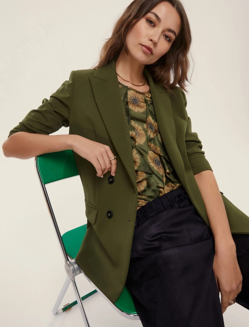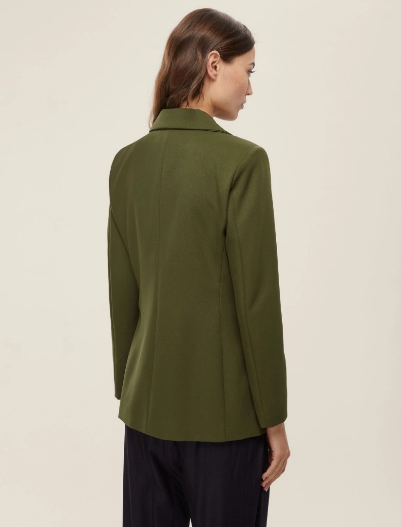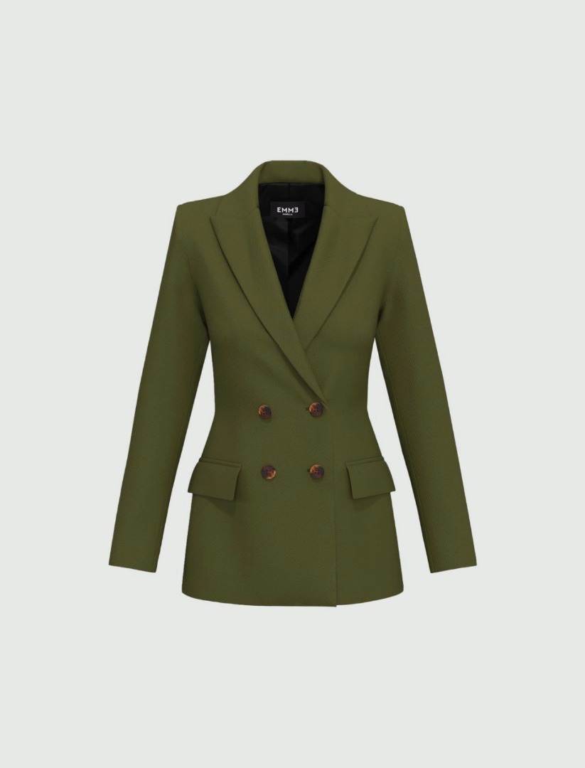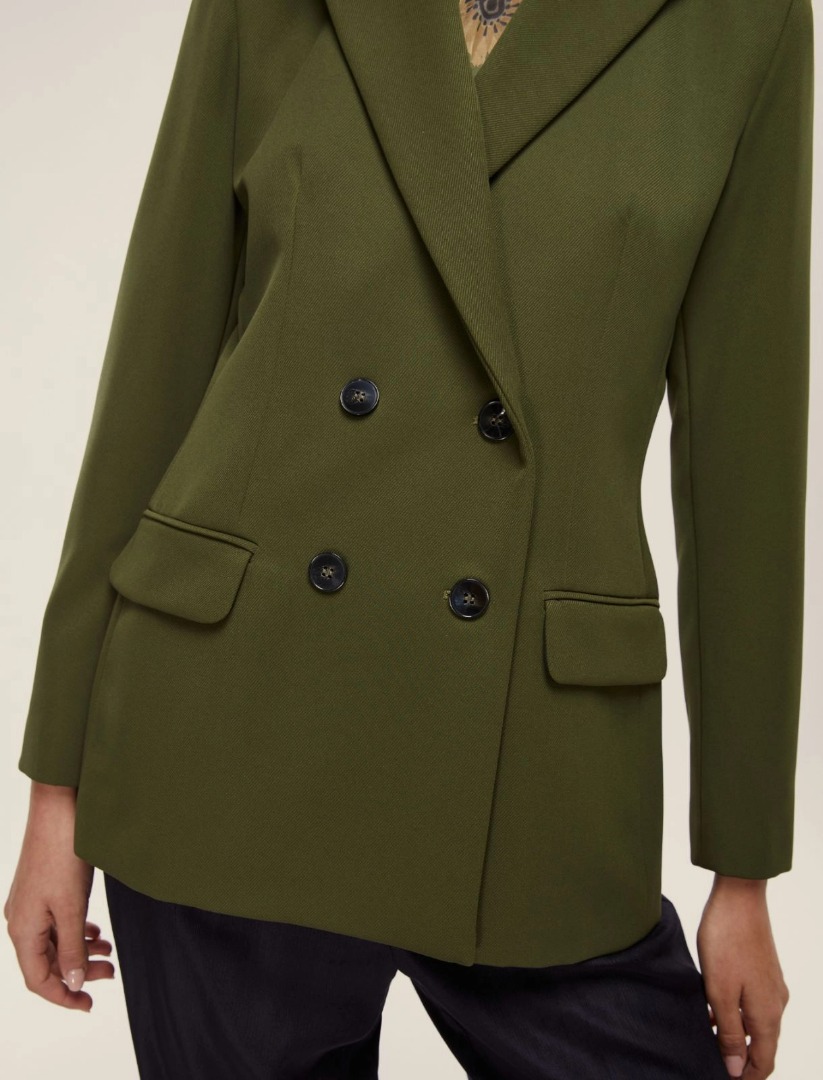 La formalità della giacca doppiopetto viene rivisitata con canoni estetici contemporanei, addolciti da forme leggermente sfiancate e da un tessuto stretch che abbraccia la silhouette. Da indossare aperta, su bluse stampate per un city look leggero e cool. In omaggio con questo capo riceverai una sorpresa firmata Luce Beauty by Alessia Marcuzzi Giacca in tessuto diagonale tecnico stretch Fit semi aderente Scollo con rever Chiusura a doppio petto con quattro bottoni Tasche con filetto e patta Capo foderato