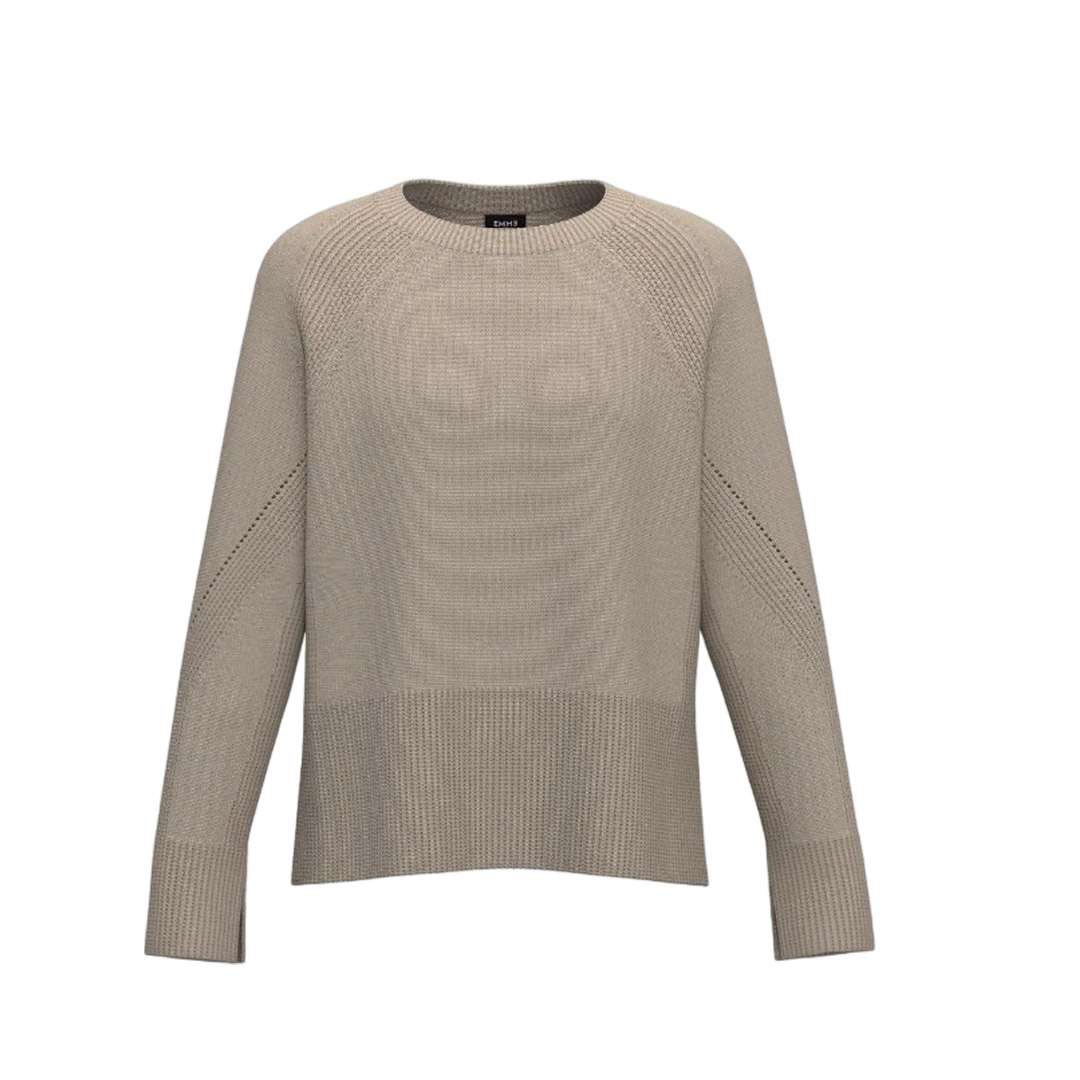 Calda e cocoon, la maglia in misto lana gioca con un fit dritto sul busto e gli spacchi laterali. Il gioco di calature e di punti a contrasto aggiunge dinamicità e una nota informale al design. Maglia in filato di misto lana, fit dritto, scollo stondato, manica raglan con dettaglio di calature, fondo con spacchi laterali e dettaglio a punto pannocchia