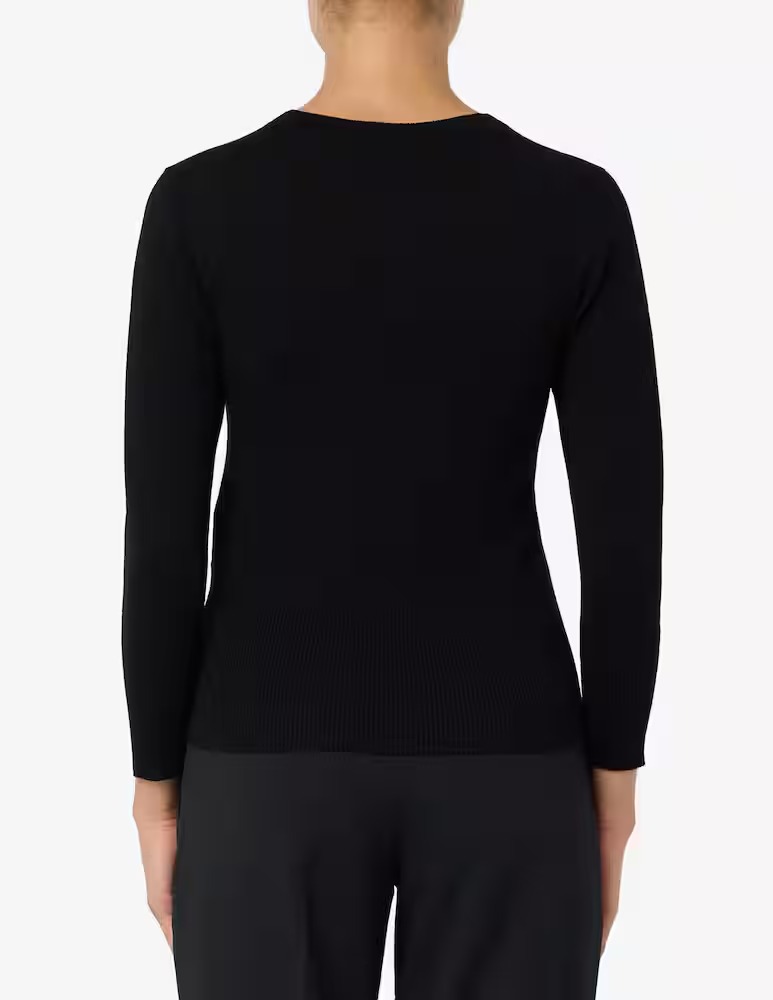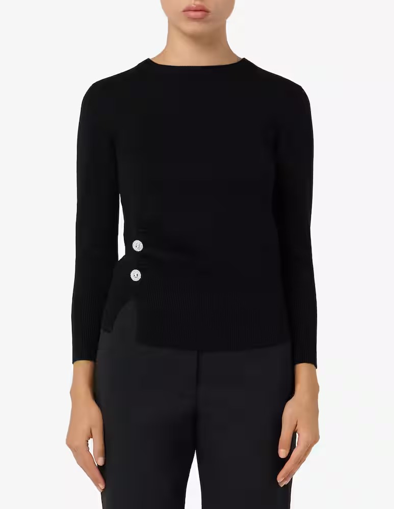 Maglia in misto viscosa stretch. Fit aderente. Scollo stondato. Maniche a tre quarti. Motivo di spacco sul fianco destro con arricciature e doppio bottone gioiello