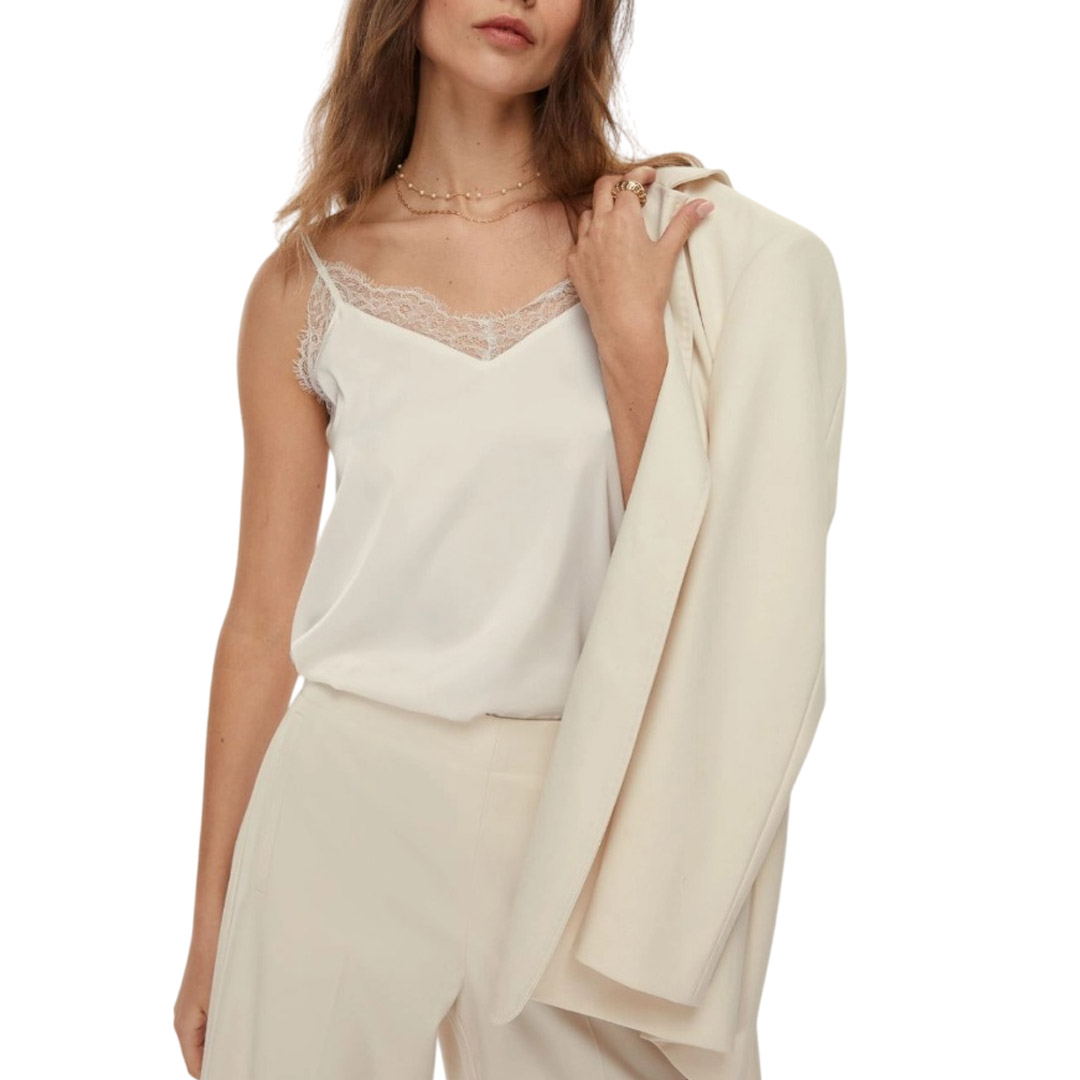 Over the top: in raso stretch e con lo scollo in pizzo, è il momento di farli uscire allo scoperto. Con la complicità di blazer, pantaloni e persino tacchi. Top in raso tecnico stretch leggero Fit leggermente sfiancato Scollo a V sul davanti Finitura con pizzo sullo scollo e sul giro manica