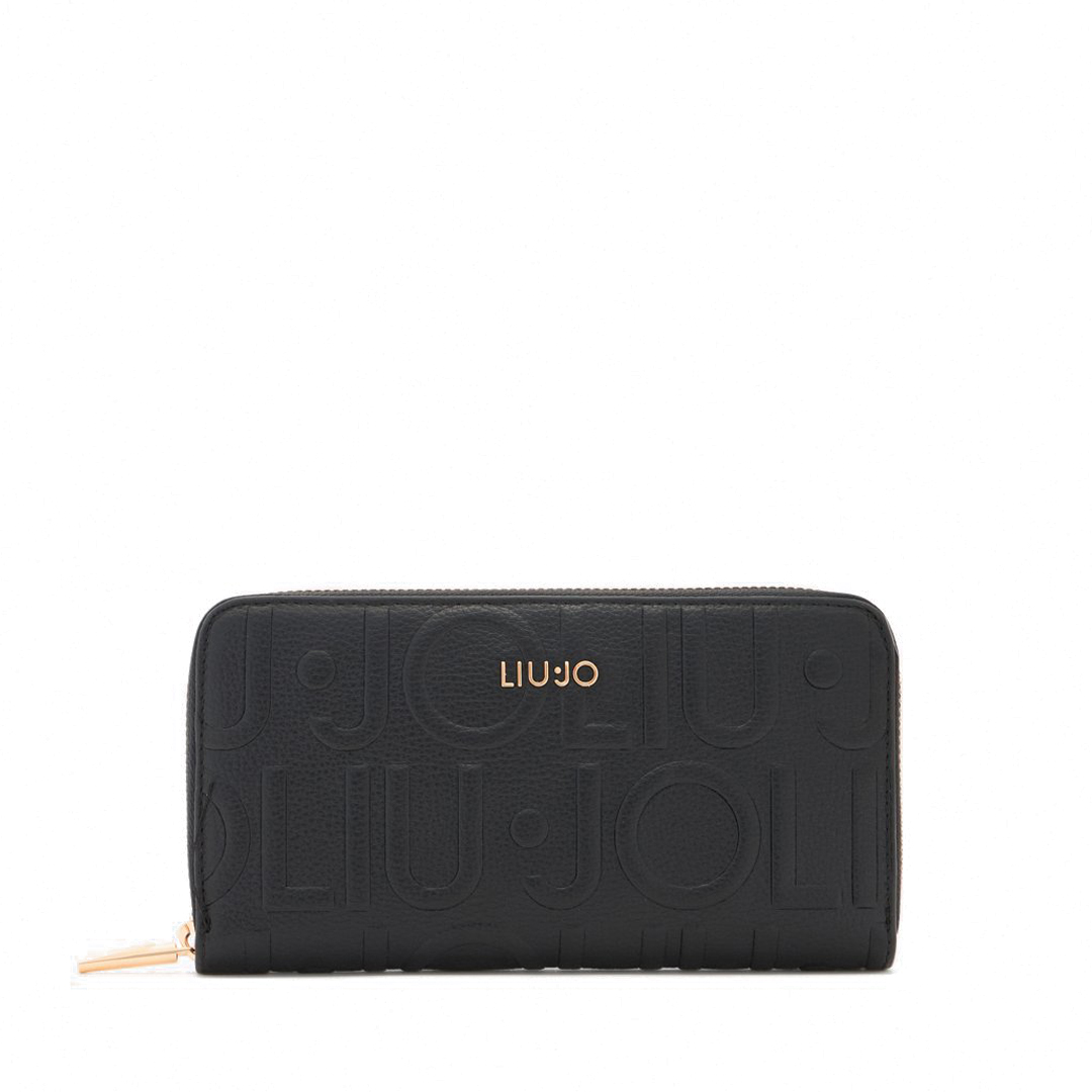 Misure: 19 x 2 x 10 cm Portafoglio zip around nero Stampa effetto bottalato Logo in metallo sul davanti Scomparto per tessere e carte business Scomparto per monete con zip Scomparto per banconote Chiusura con zip Prodotto "Liu Jo Better"