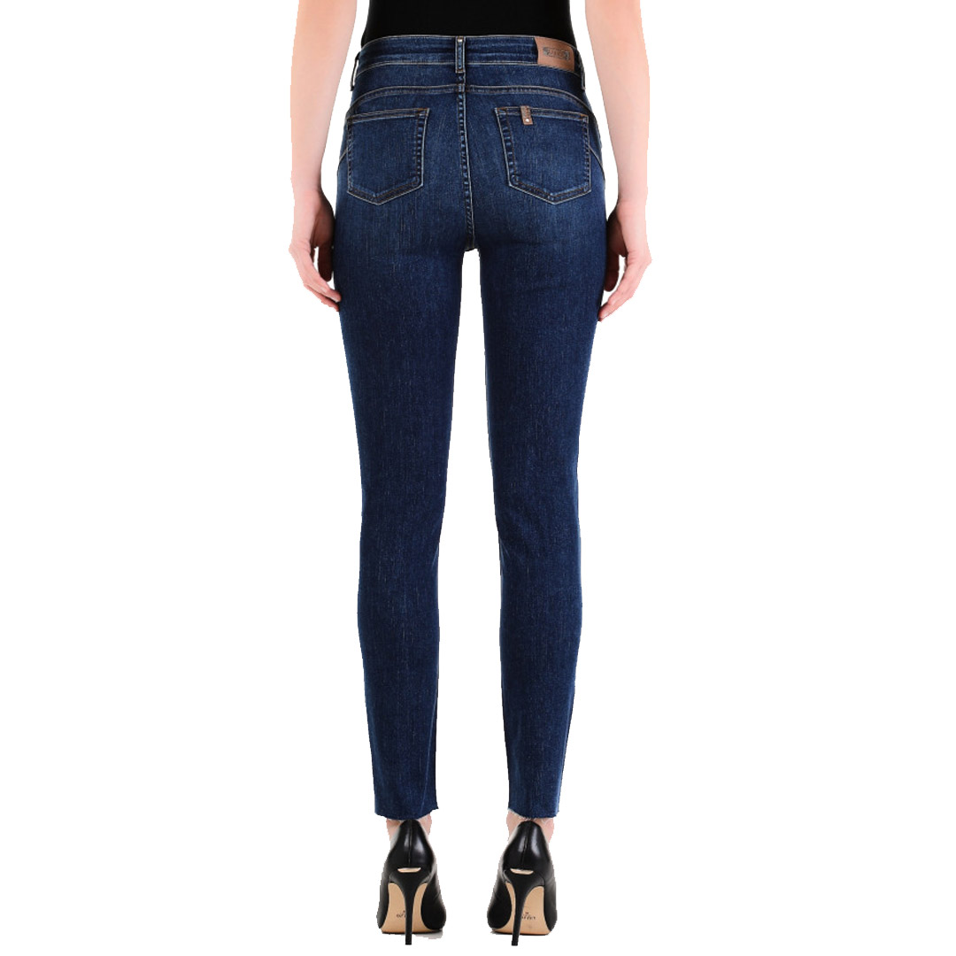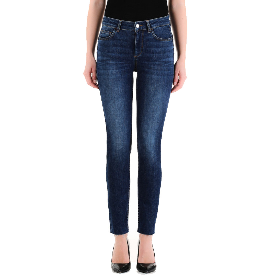 Pantalone in denim scuro Liu-Jo, aderente a vita media con tasche laterali e posteriori con chiusura con cerniera e bottone.