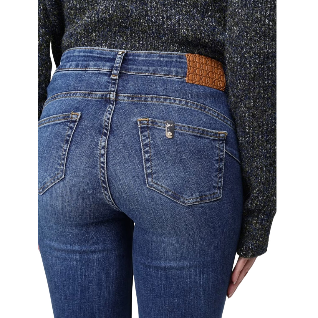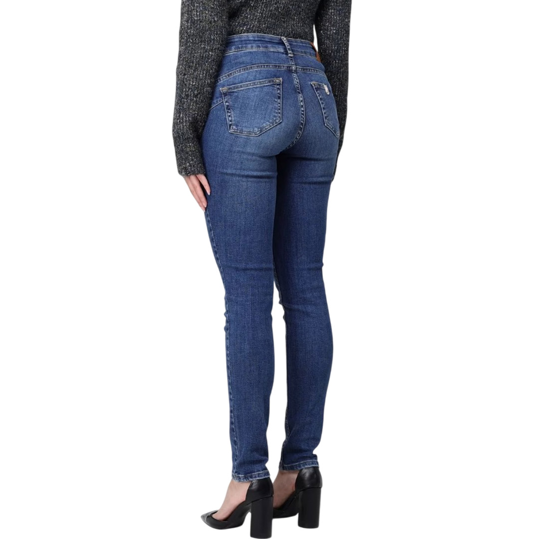 Jeans in denim di cotone stretch Tagli bottom up che ridefiniscono le forme con eleganza, donando armonia e sostegno senza rinunciare al comfort Lavaggio used Vita alta Gamba skinny Modello cinque tasche Salpa logata Logo in metallo Chiusura con bottone e zip nascosta
